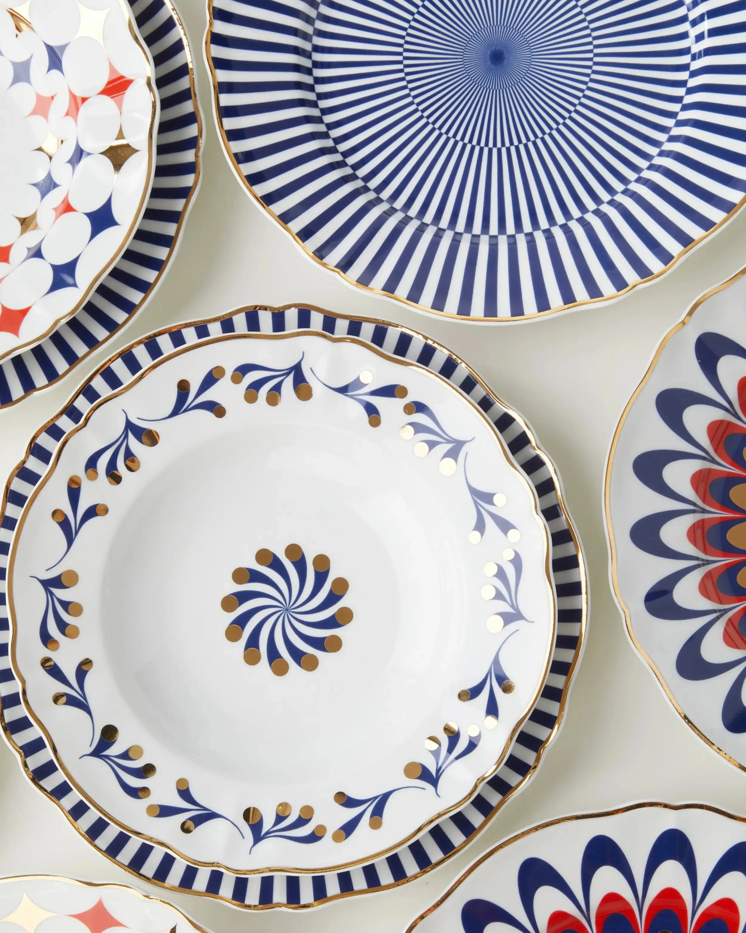 Unexpected and sophisticated, the Bitossi Abracadabra set of 4 soup plates redefines the art of table presentation. Conceived by LaTigre as part of their dialogue with Bitossi Home, this collection explores the fine line between intuition and precision. The result is a series of luxury deep plates that combine visual rhythm, bold graphic symbols, and delicate gold-edged finishes. Each plate captures light differently, creating a dynamic harmony between color, texture, and meaning.