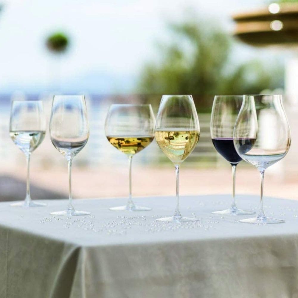 قم بتعزيز تجربة تناول النبيذ لديك مع تصميم Riedel : أكواب وزجاجات مميزة، مثل كأس بوردو سوبرليجيرو وديكانتر مامبا.