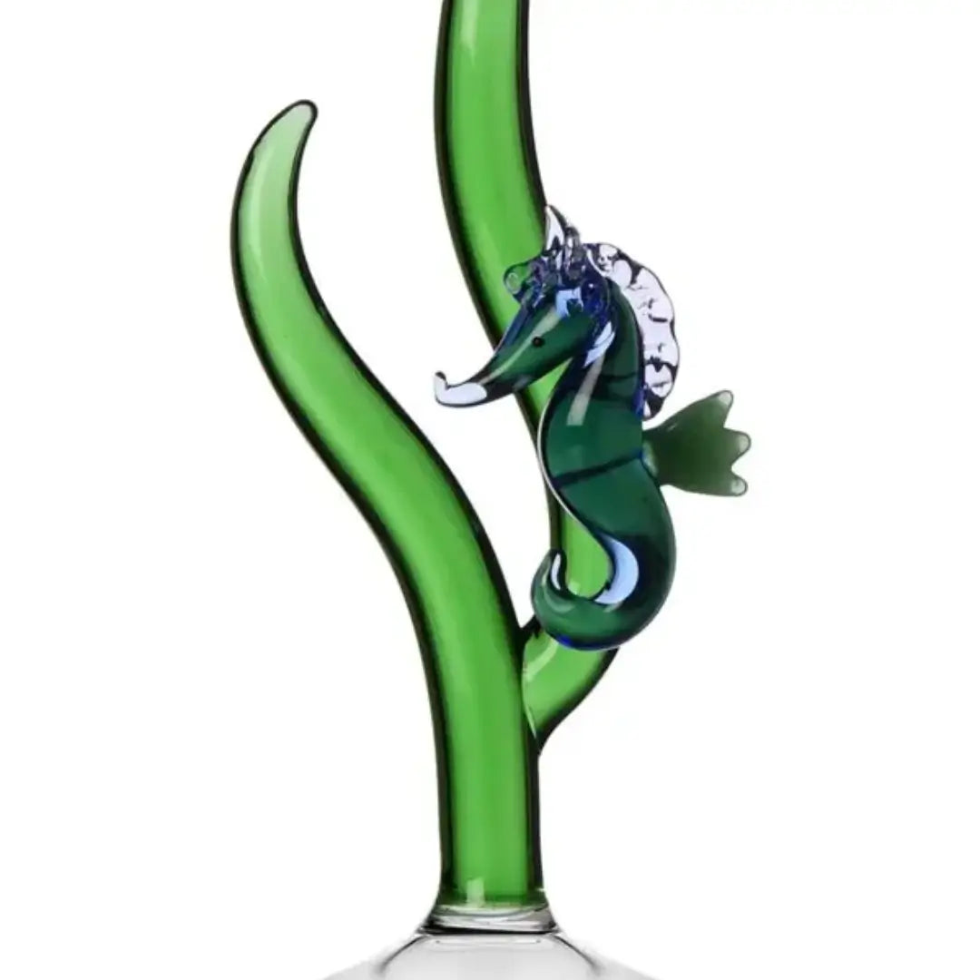 كل عنصر من هذا طبق الحلوى المصنوع يدوياً من البورسليكات يعكس موهبة Baldereschi في تحويل الأشكال البسيطة إلى تركيبات حالمة. القاعدة الشفافة للحامل، المزينة بحصان بحر أزرق رقيق، تذكرنا بالحركة السلسة لحياة المحيط: مخلوق صغير خُلد في الزجاج بدقة مذهلة. صُنع بالكامل يدوياً وعُمل بواسطة مصابيح على يد حرفيي Ichendorf، هذا القطعة تجسد التناغم بين التقنية والخيال، حيث يصبح الزجاج تعبيراً حياً عن الماء والضوء.