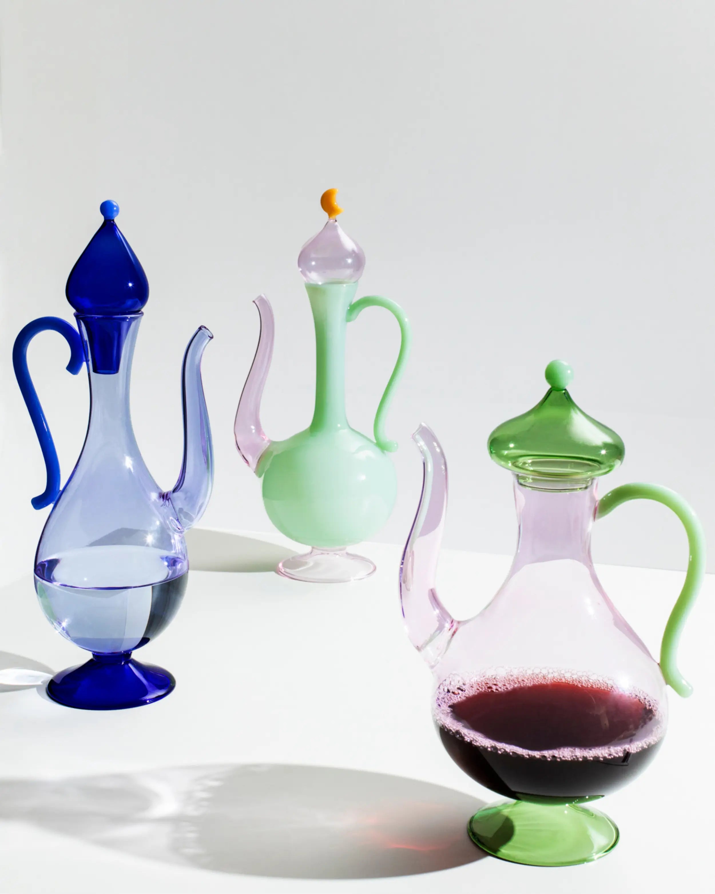 متوفر بدرجات لافتة من اللونين الأخضر والأزرق، يستخدم الإبريق اللون كلغة. النسخة الخضراء تجلب النضارة والحيوية، مستوحاة من الحدائق عند الغسق أو درجات ألوان الطلاء الخزفي العميقة. النسخة الزرقاء تثير الهدوء والعمق، تذكر بسماء الغسق أو انعكاسات المحيط الهادئة، محولة كل مشروب إلى لحظة تأمل. يحول الماء العادي إلى شيء مشع، والنبيذ إلى عرض بألوان الجواهر، والعصير إلى احتفال باللون. تكمن براعة Baldereschi في خلق ليس مجرد وعاء بل جو.