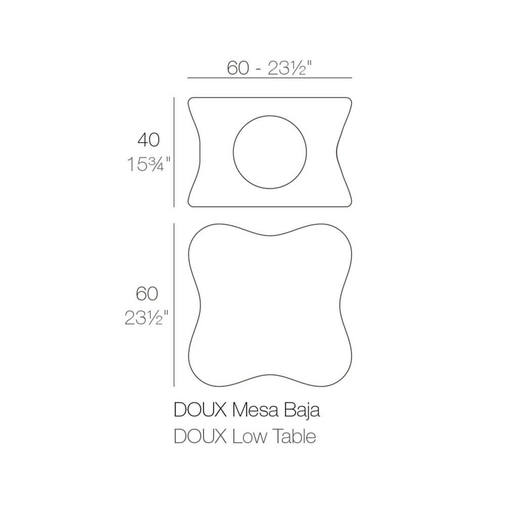 DOUX هي مجموعة ديناميكية وغير تقليدية من الأغراض، التي صممها Karim Rashid حصريًا لـ Vondom. تتميز هذه العائلة من المنتجات بتصميم أصلي وأشكال طبيعية وخفيفة تهدف إلى المرح وبالطبع للجلوس. التعددية والديناميكية هما الصفات المميزة لهذه المجموعة، التي تتكون من: الكرسي BUTACA، الأريكة SOFA، الطاولة MESA والإناء MACETA. الطاولة DOUX MESA مصنوعة من البولي بروبيلين غير الشفاف، تم الحصول عليها من خلال طريقة التشكيل الدوراني. هذا المنتج مثالي للاستخدام في الهواء الطلق والداخل، وهو مناسب بشكل خاص للعقود. أبعادها 60 × 60 بارتفاع 40 سم