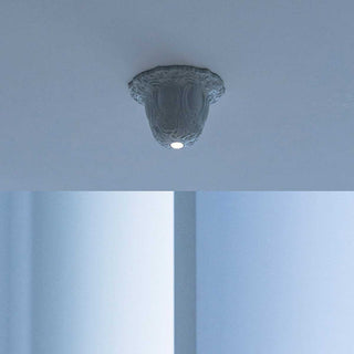 The designer Omar Carraglia develops the Sanmartino ceiling lamp for the ligthing brand Davide Groppi. The designer has deliberately detached the old crystal chandelier, leaving the ceiling rose alone and transforming it into a fantastic ceiling lamp with a small LED light point that illuminates everything that surrounds it. Sanmartino stands out for its classical bas-relief decorations that make it suitable to any type of environment, from domestic to contract.
