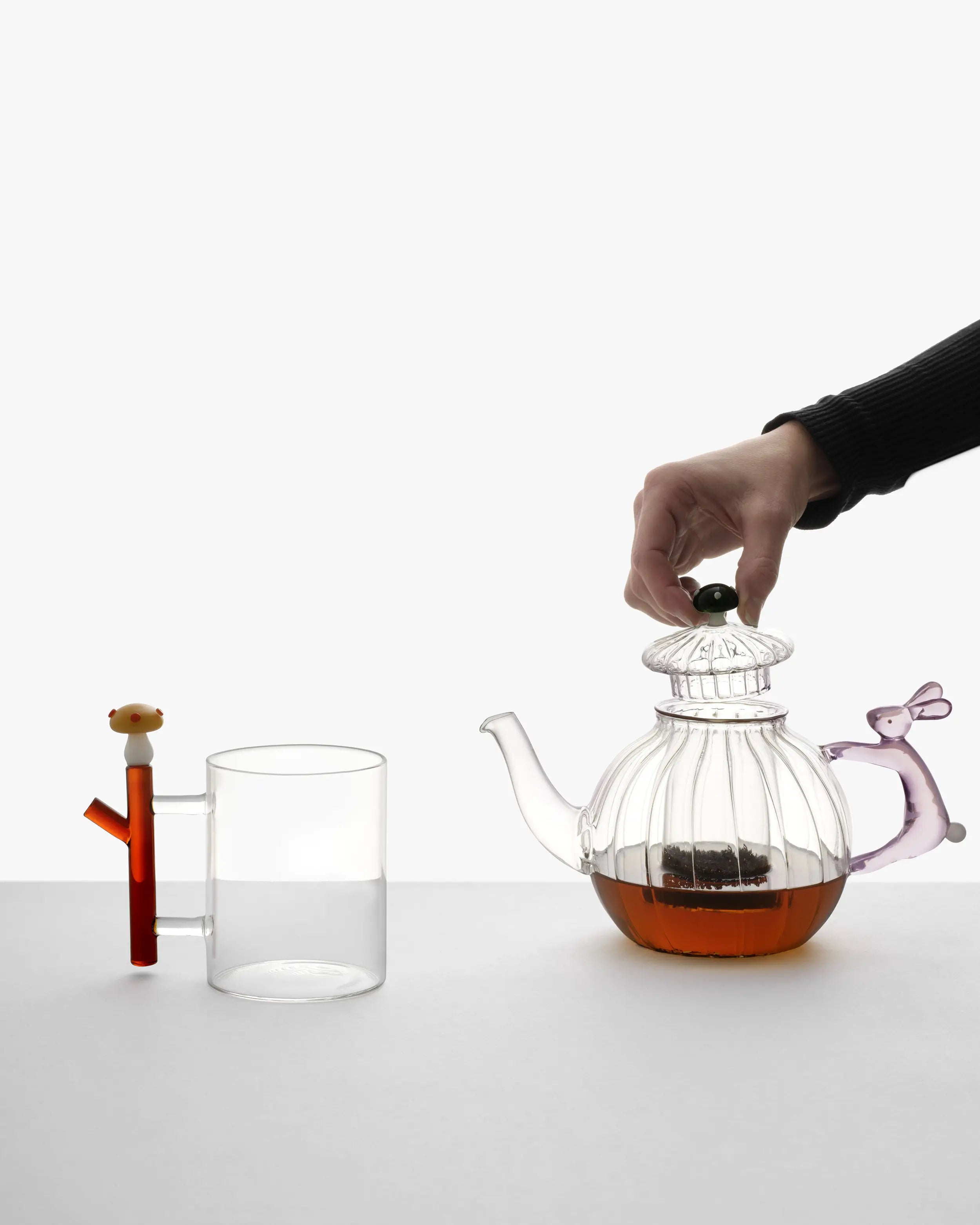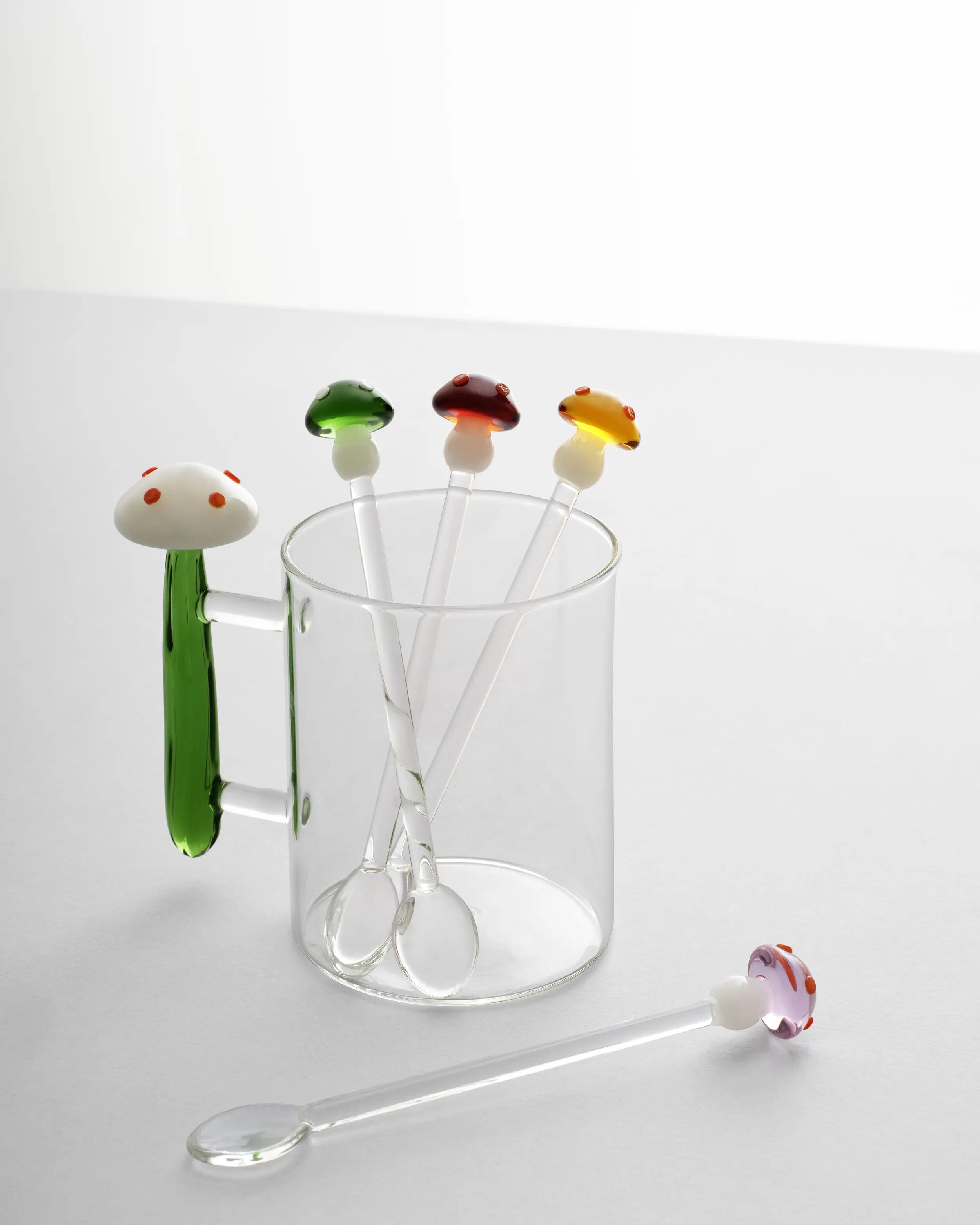 The Ichendorf cups and mugs collection welcomes a joyful accent with the Alice mug, where a tiny sculpted mushroom seems to sprout from crystal-clear glass. Conceived by Alessandra Baldereschi, this piece captures a poetic, almost fairy-tale spirit while keeping a refined, contemporary line that suits both creative homes and professional hospitality settings. The mug is part of the wider Alice family and is available with the mushroom design in different colours, adding curatorial freedom to mix and layer looks across the table.
