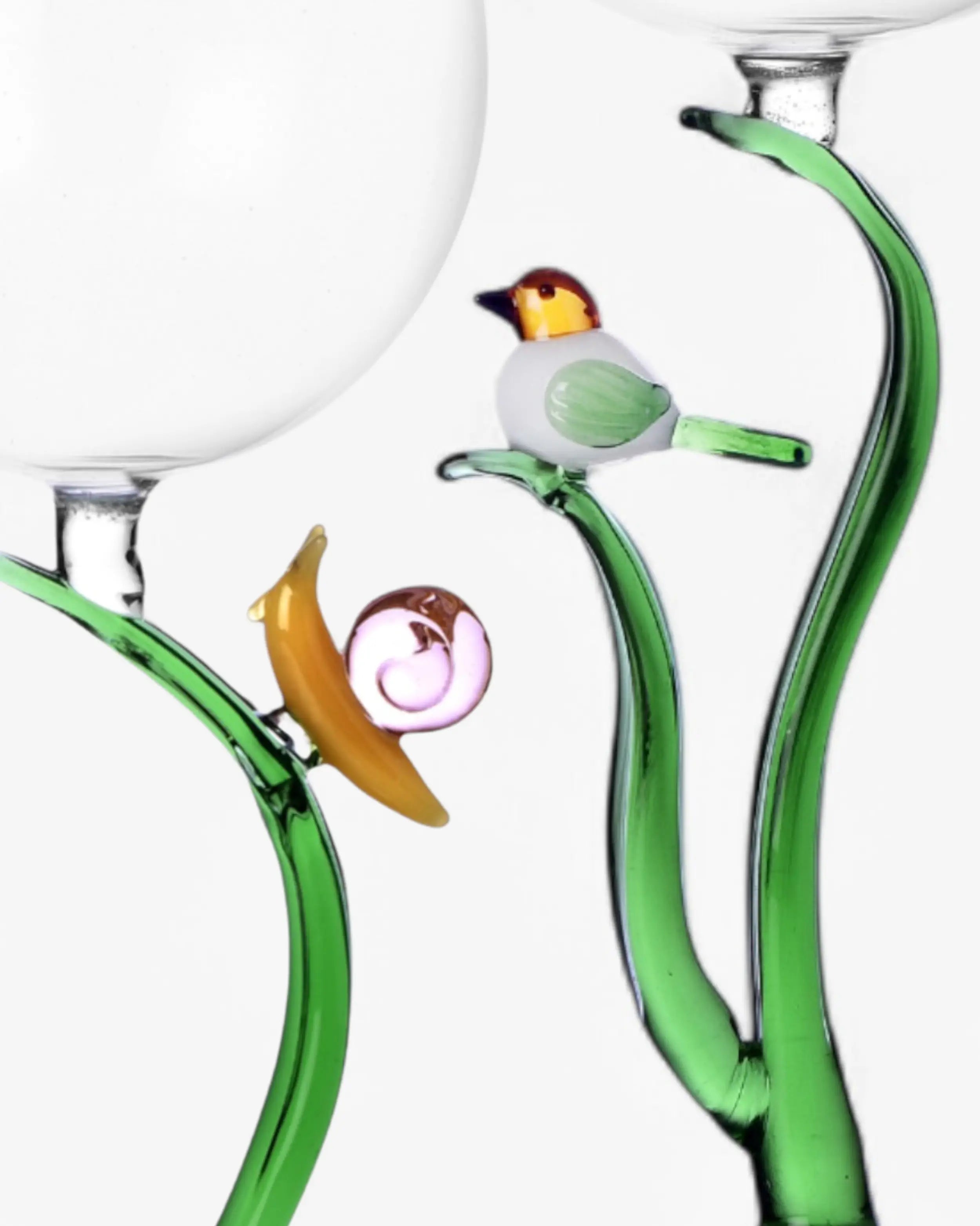 Every goblet in the set is handmade in borosilicate glass and lampworked by artisans, who use fire and precision tools to sculpt the delicate figurines inside. Each piece of this Alessandra Baldereschi x Ichendorf collection bears slight variations, a signature of its handmade origin. The animal details are playful yet elegant, standing out against the clarity of the glass without overwhelming its function. Dishwasher safe at low temperatures, these calici are resistant and lightweight, balancing utility with artistry. They are glasses designed to be used, admired, collected, and shared as part of refined home accessories or gift ideas.