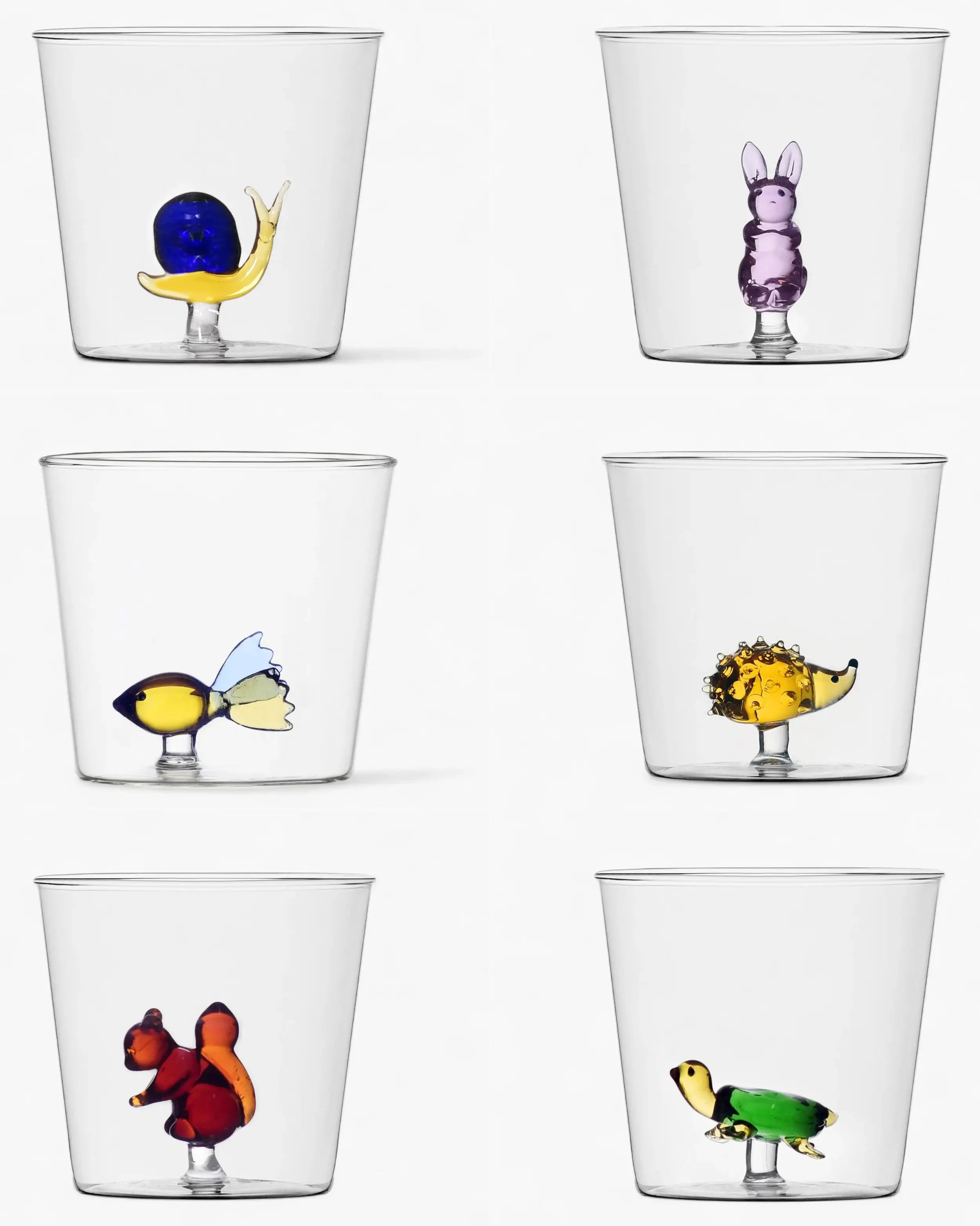 The Ichendorf Animal Farm set 6 tumbler mix land and sea fantasy is a celebration of storytelling through design. Conceived by Alessandra Baldereschi, this collection blends humor, craftsmanship and emotion in one radiant ensemble. Inside each glass, small creatures from forest and ocean coexist: rabbits, turtles, fish and hedgehogs, captured mid-motion as if part of a dreamlike ecosystem. Their vivid colors and delicate proportions bring character to every table, evoking curiosity and joy with every glance or sip; like the true nature of the entire Animal Farm collection. It is not just glassware; it is a small theatre of life in transparency.