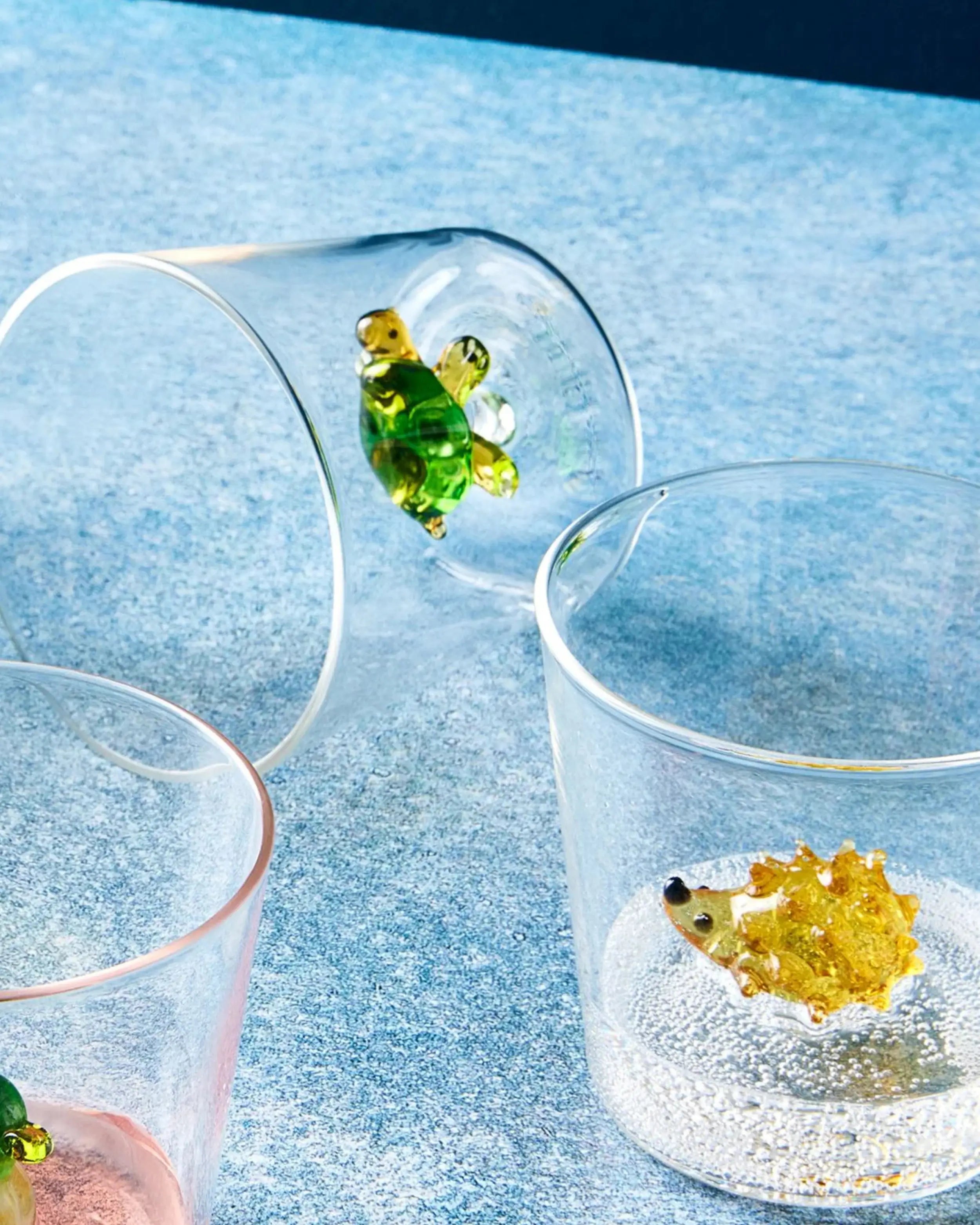Baldereschi’s design approach brings storytelling to the table without compromising on elegance. The animal motif drinking glass set transforms simple serving into an act of imagination. Sea and land creatures appear suspended in motion: a duck gliding, a fish darting, a hedgehog pausing; creating visual rhythm across the collection. Beyond their decorative charm, these whimsical designer tumblers offer perfect balance and tactile comfort. Their transparent walls enhance the color of drinks while allowing the inner sculptures to shimmer in the light.