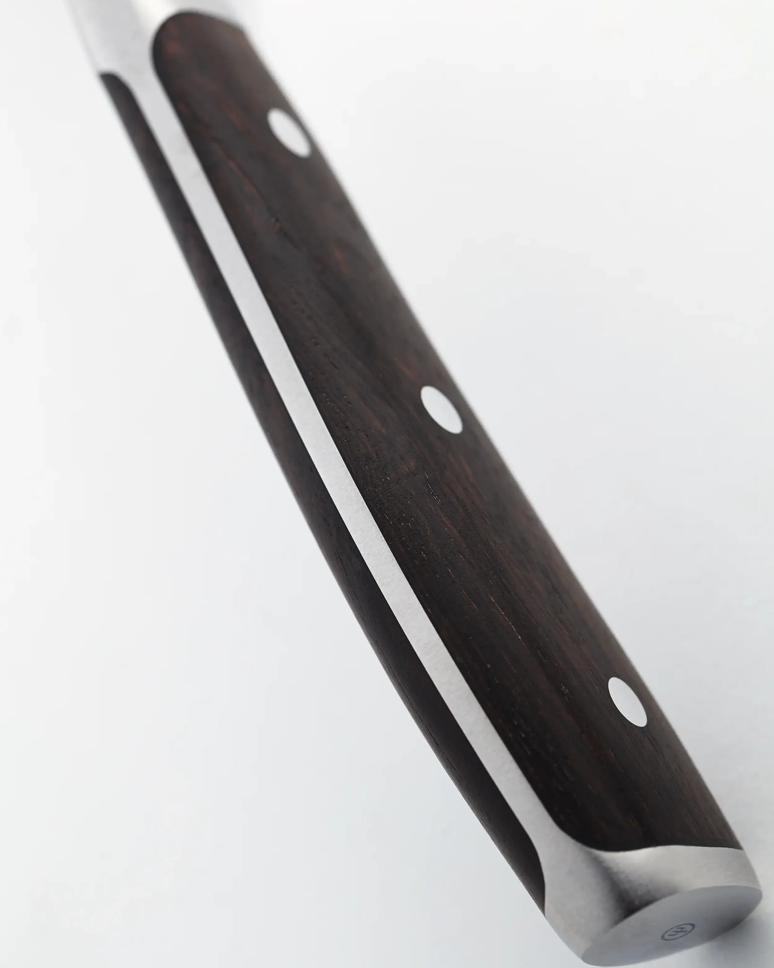 Handcrafted in Solingen, Germany—the legendary hub of blade mastery—this knife by Wüsthof boasts a blade and internal handle forged from a single piece of high-quality steel. This construction delivers unwavering balance and exceptional durability. Its handle, fashioned from rare African Black Wood and accented with three rivets, provides a natural feel and timeless beauty in your hand.