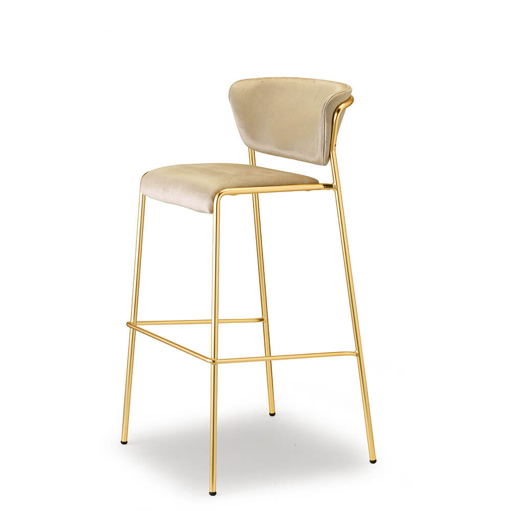Stool by Scab Design. For over 50 years, Scab is the 100% Made in Italy brand that becomes a leader in the furniture industry. Chairs, armchairs, stools and tables made with attention to detail and designed with prestigious raw materials. Since 1957, the Italian brand has been dealing with interior and exterior design, decorating offices, restaurant, and even domestic environments with style and elegance. Everything with the tipycal elegance that distinguishes Scab Design. Steel Stool designed by Marcello Ziliani. Seat and back: upholstered. 4-leg frame in 16 mm. diam. tubular steel tube. Stackable. For indoor use.. Scab Design Lisa stool seat h. 75 cm. satin brass effect legs and beige velvet seat.