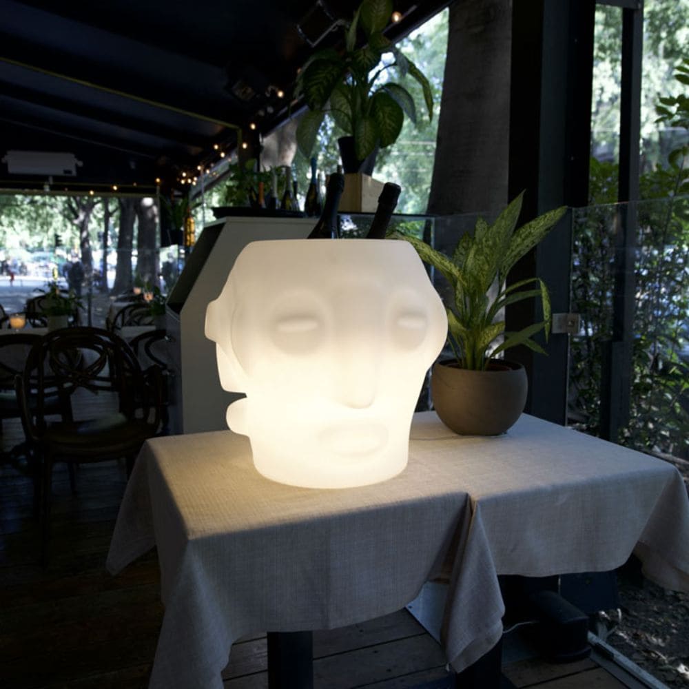 Threebù Party lighting bottle rack from the Afrika collection, designed by Marcantonio Raimondi Malerba for Slide. Threebù Party is a bottle rack with a very particular design: three faces decorate Threebù, transforming a simple piece of furniture into a symbol around which to meet, giving an ancestral and pop touch to any environment. Afrika is a collection of sofas, armchairs, vases and other design accessories that revisits in a modern way animals and faces typical of the African world. Discover the entire Afrika collection and choose your favorite color!