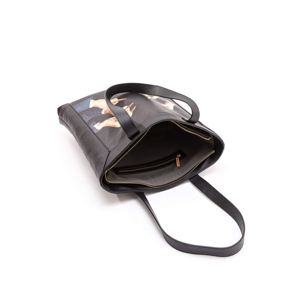The polyester PVC shopper bag combines personality and practicality. Its structure is soft yet resilient, making it suitable for everyday use: from morning commutes to weekend adventures. The art print tote bag adds a pop of humor to minimalist outfits and stands out in any context. Perfect for design lovers and unconventional spirits, it redefines the idea of a functional accessory, turning it into a conversation piece. The print’s glossy finish and precise detailing make every bag a small collectible object, alive with irony and sophistication.