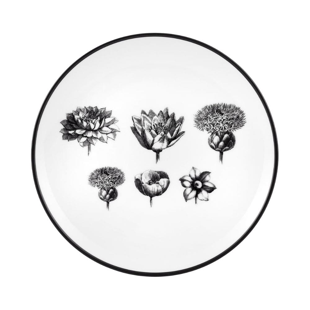 Herbariae bread and butter plate, designed by Christian Lacroix for Vista Alegre. The Herbariae bread and butter plate, finely decorated with a flower and a black border that give a touch of unique elegance thanks to the contrast of colors, is the ideal element to make your table unique. The Herbariae collection takes inspiration from five flowers (the poppy, the narcissus, the lotus, the dahlia and the thistle) and makes them protagonists of the entire line representing them in the style of ancient herbariums and combining them with soft colors, thus evoking a watercolor effect. Discover the entire Herbariae collection and make every occasion unique.