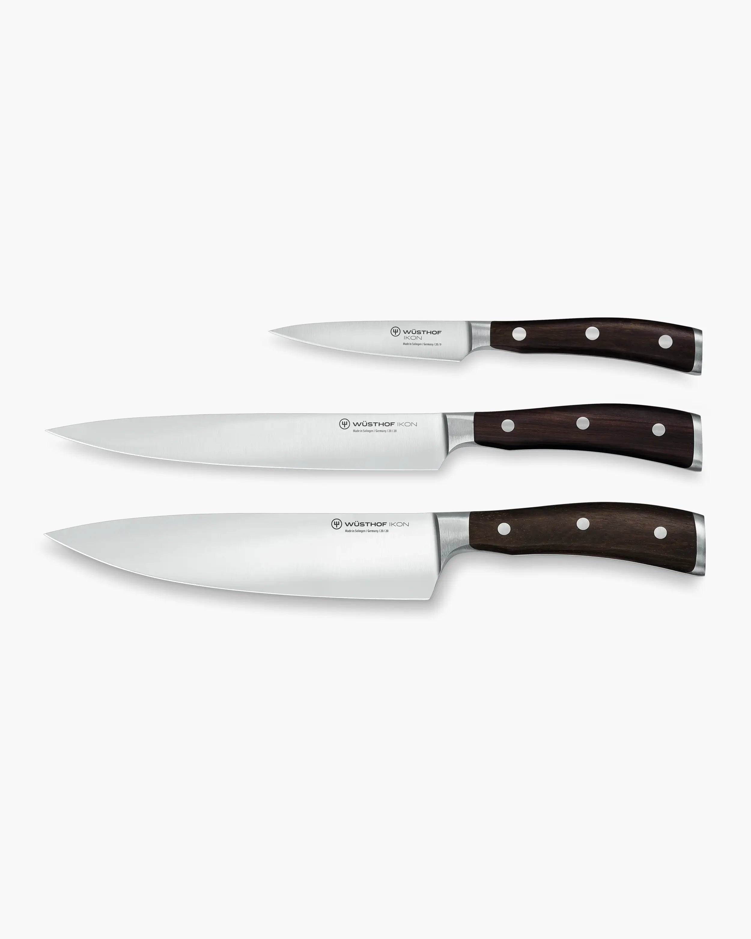 Designed by Wüsthof, this elegant wusthof ikon set features a cook's knife (20 cm), a carving knife (20 cm), and a paring knife (9 cm)—the essential trio for slicing, dicing, and refining your culinary craft. Their blades glide effortlessly, while the ergonomic handles made from African Blackwood are triple-riveted for a secure grip, embodying the strength of heritage and precision of innovation.