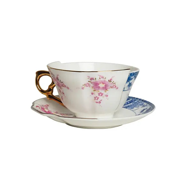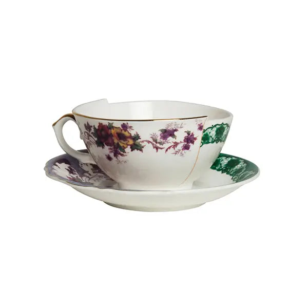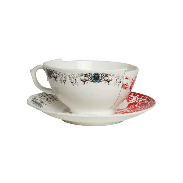 Die vollständig aus dekoriertem Bone China Porzellan gefertigte Seletti Hybrid Porzellan-Teetasse mit Untertasse besitzt ein leuchtendes Finish, das ihre filigrane doppelte Dekoration hervorhebt. Die Oberfläche ist klar in zwei kontrastierende Seiten unterteilt, ein Markenzeichen der Hybrid-Ästhetik, die sowohl Trennung als auch Einheit symbolisiert. Ein goldener Henkel verleiht einen luxuriösen Akzent und verstärkt die skulpturale Präsenz der Tasse, ohne Komfort oder Funktionalität zu beeinträchtigen. Für den Lebensmittelgebrauch konzipiert, umfasst das Set eine Teetasse und eine passende Untertasse, die beide dieselbe doppelte visuelle Identität widerspiegeln. Als Fortsetzung der kreativen Erkundung der CtrlZak und Seletti Zusammenarbeit gehört dieses Objekt zur Familie der Seletti Tischkultur und zur umfassenderen Seletti Hybrid Kollektion. Für Stylisten, die Hybrid Porzellan Kollektionen komponieren oder erforschen, wie man eine Designer-Teetasse stilvoll arrangiert, wird dieses Stück zu einem unverzichtbaren Baustein für eklektische und ausdrucksstarke Tischdekorationen.Ein raffinierter Akzent für kreative Wohnräume und zeitgenössische Teerituale