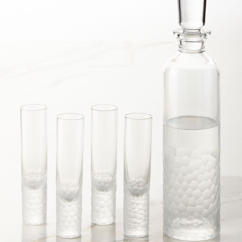 Etui mit Wodka-Karaffe und 4 Shots, aus der Artic-Kollektion, die Stephen Jones für die Marke Vista Alegre entworfen hat. Das Artic-Set wurde zum Servieren von Wodka entworfen. Die Karaffe und die Gläser haben das gleiche Muster: Das ursprüngliche Glas endet mit einem Satin-Finish und hebt den handgefertigten Kristallteil hervor. Worauf warten Sie noch? Kaufen Sie es jetzt!