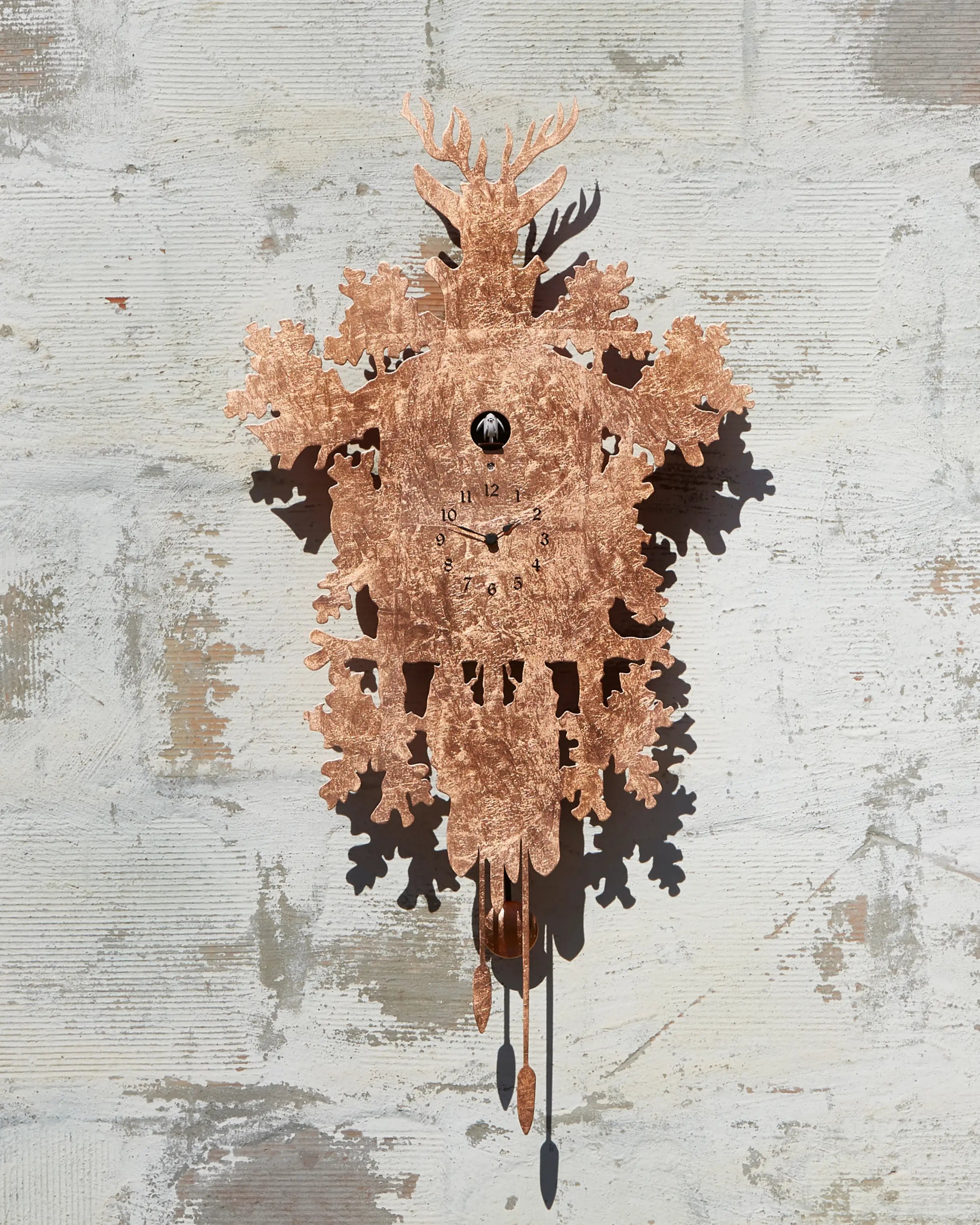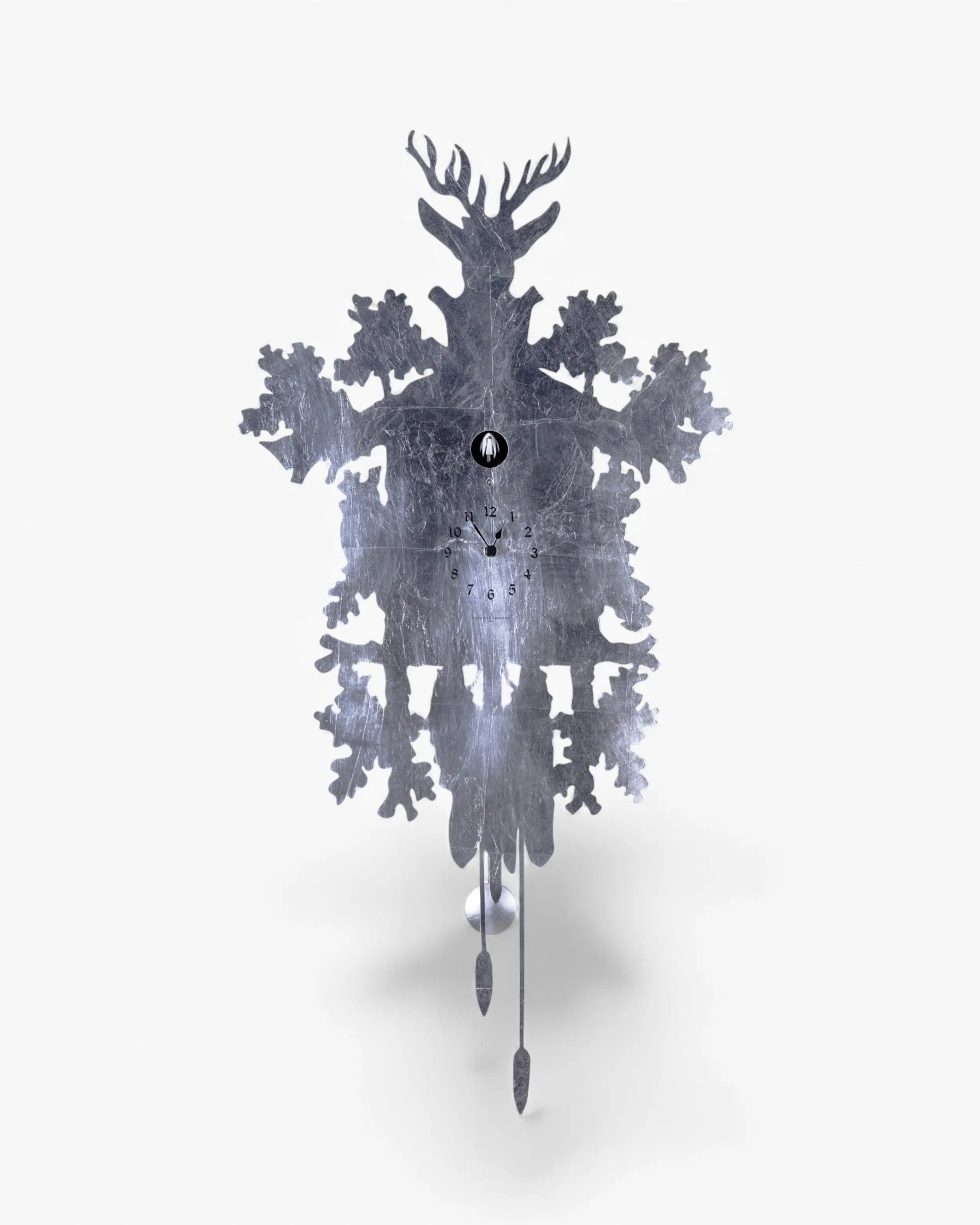 A silent quartz mechanism lies at the heart of the clock, offering uninterrupted precision and an atmosphere free from acoustic distractions. Powered by two type D batteries, the movement is engineered by Pascal Tarabay for longevity, while the cuckoo’s adjustable volume allows the user to shift between high, low or complete quiet. A practical light sensor ensures that the cuckoo remains inactive in darkness, a thoughtful solution that aligns perfectly with nuanced interior environments seeking elegant yet intelligent decor. When placed near narrative wall compositions or sculptural accents from Ibride wall decorations, the clock’s theatrical presence becomes even more expressive.