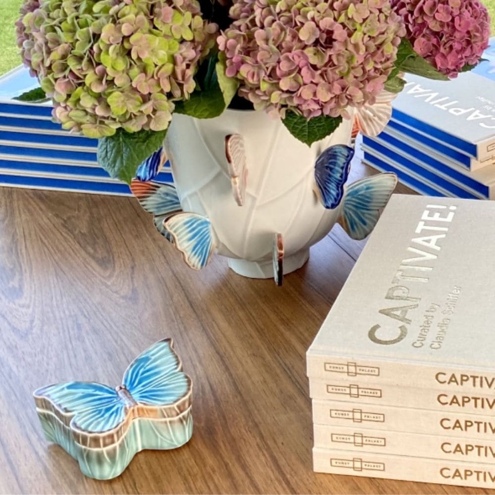 Inspiriert von den ätherischen Landschaften rund um Schiffers Landhaus verwandelt die Cloudy Butterflies Kollektion Alltagsgegenstände in sammelbare Kunstwerke. Die zarten Schmetterlinge symbolisieren Freiheit, Transformation und Eleganz – Werte, die die Vision von Claudia Schiffer für Bordallo Pinheiro perfekt widerspiegeln. Als Teil einer größeren Familie von skulpturalen home accessories kann diese Box wunderschön mit bowls, trays, or plates aus derselben Linie kombiniert werden, um die Kontinuität von Design und Erzählung in Ihrem Wohnraum zu verstärken.