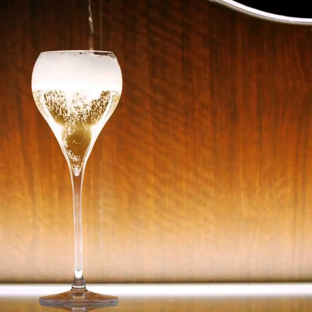 Die charakteristische ballonförmige Kelchform des Italesse Balloon Flute Set 6 Champagnerflöten cc. 210 aus klarem Glas lässt die Bläschen sanft aufsteigen und bietet gleichzeitig eine größere Oberfläche, auf der sich die Aromen entfalten können. Diese Balance bewahrt die Lebendigkeit der Schaumweine und verstärkt ihr Bouquet, wodurch diese Stielgläser besonders für anspruchsvolle Verkostungen geeignet sind, bei denen Komplexität und Frische harmonisch zusammenkommen müssen.Klarheit und Langlebigkeit für den professionellen Einsatz