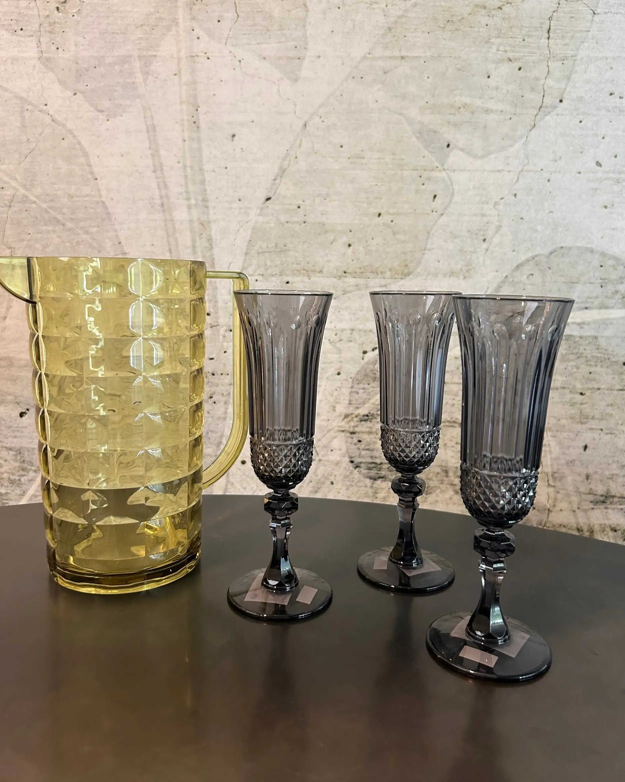 Die Mario Luca Giusti Saint Germain Flute Fumè verbindet visuelle Raffinesse mit Langlebigkeit durch ihr hochwertiges Acryl-Champagnerflöten-Glas. Für den Lebensmittelgebrauch konzipiert, gewährleistet sie sowohl Sicherheit als auch Eleganz bei bemerkenswerter Widerstandsfähigkeit. Das Material ermöglicht es der Flöte, als praktische unzerbrechliche Champagnerflöte zu fungieren – perfekt für Terrassen, Gartenpartys oder stilvolle Empfänge im Freien. Zur Erhaltung ihres strahlenden Aussehens wird Handwäsche empfohlen. Das Glas ist nicht für Mikrowellen oder herkömmliche Backöfen geeignet und temperaturbeständig von minus zehn bis fünfzig Grad. Die Reinigung sollte mit neutralem Reinigungsmittel und nicht scheuernden Materialien erfolgen, um die Klarheit zu bewahren. Durch diese Pflege bleibt dieses Stück italienischer Designer-Tischgläser über lange Zeit brillant und edel.Italienisches Design für elegante Feiern