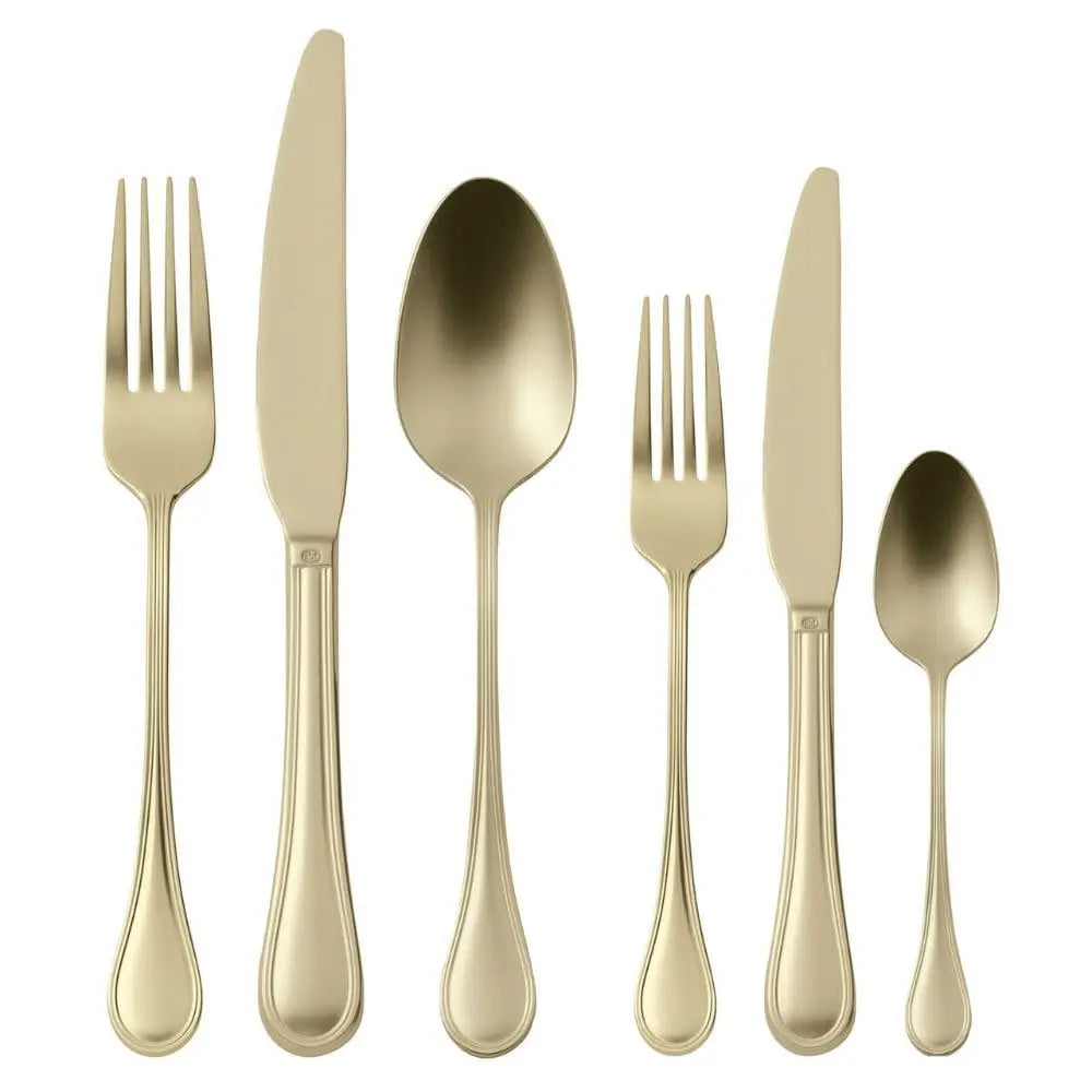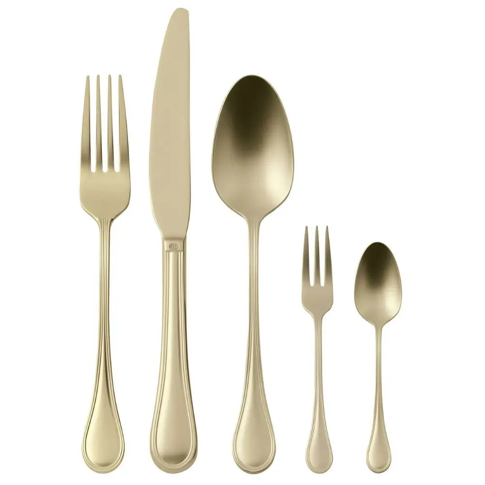 In die Welt des Sambonet Bestecks integriert, ist das Royal Set darauf ausgelegt, den Rhythmus des modernen Essens zu unterstützen. Die sanften Griffkonturen sorgen für einen komfortablen Halt, während die präzise geformten funktionalen Enden eine fließende Handhabung bei verschiedenen Gängen ermöglichen. Jedes Utensil ist ausbalanciert, um Kontrolle und Stabilität in der Hand zu gewährleisten. Innerhalb der Interpretationen von hochwertigem PVD-goldbeschichtetem Edelstahlbesteck zeigt die Kollektion, wie Eleganz und Benutzerfreundlichkeit nahtlos koexistieren können.