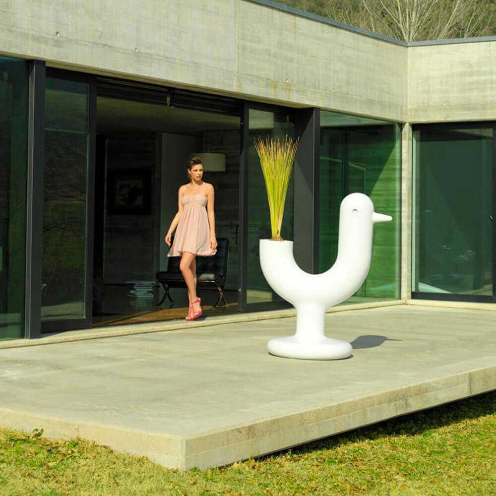 Lustig und ironisch, PEACOCK ist VONDOMs originelle Vase, entworfen von Meister Eero Arnio. Der Designer ließ sich vom Pfau inspirieren, einem Tier, das ihn schon immer sehr beeindruckt hat: Charmant und geheimnisvoll, wenn Pfauen ihr buntes Rad bilden, erfüllen sie den Raum um sie herum mit Helligkeit und Ehrfurcht. Arnio versucht, den Charme der Pfauen in seiner Vase PEACOCK nachzubilden, die aus mattem, geprägtem Polypropylen besteht und in den Farben Weiß und Schwarz erhältlich ist. Vondom verarbeitet gekonnt Kunststoffmaterialien und schafft einzigartige und gewundene Formen für eine einzigartige Vase, die Ihren Gärten und Außenumgebungen Ironie und Leichtigkeit verleihen kann.