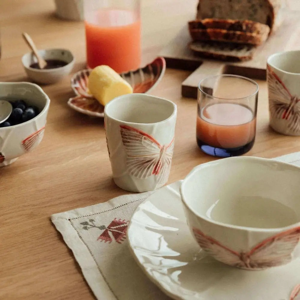 Von Kunsthandwerkern in Portugal geformt und glasiert, trägt jede Tasse subtile Variationen in Ton und Relief, ein Beweis für wahre Handwerkskunst. Die Wärme der Terrakotta steigert sowohl das taktile als auch das visuelle Vergnügen, während die sorgfältige Handbemalung jedem Schmetterlingsflügel Tiefe verleiht. Diese zarten Unvollkommenheiten machen jede Tasse zu einem einzigartigen Ausdruck von Kunstfertigkeit und bringen die menschliche Note zurück in das zeitgenössische Design.