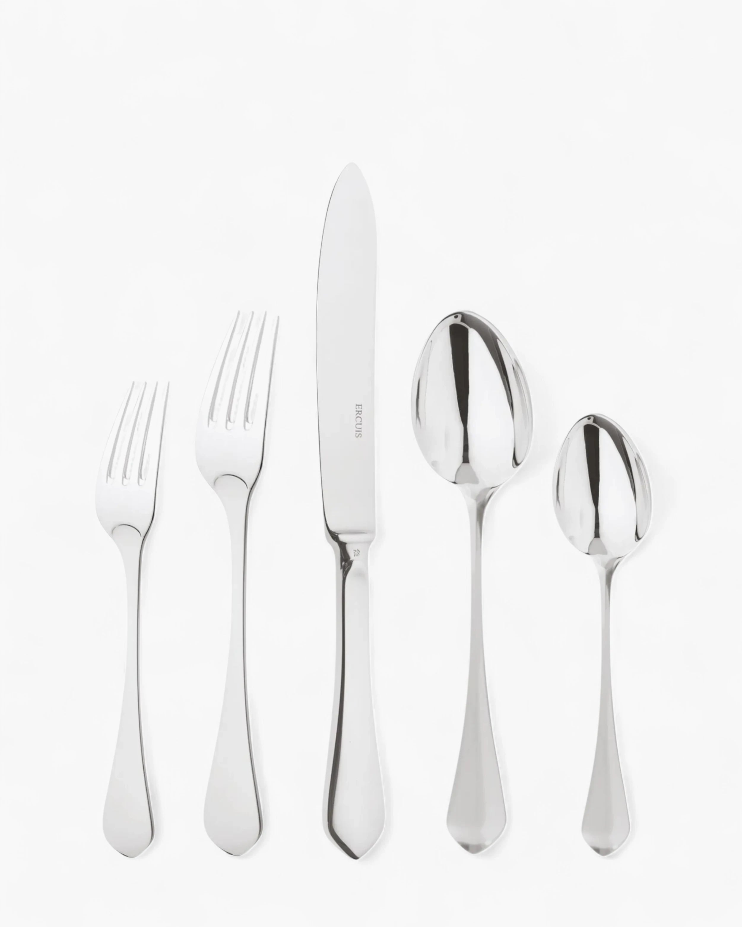 Weil jedes Detail zählt. Mit seiner feinen Verarbeitung, zeitgenössischen Eleganz und der Möglichkeit, es mit anderen renommierten Kollektionen wie der Latitude-Kollektion oder der Saturne-Kollektion zu kombinieren, lädt es dazu ein, Ihren Stil am Tisch auszudrücken. Ein echtes Statement-Stück für jede luxuriöse Tischdekoration.Ercuis Citeaux 5-teiliges Besteckset aus Edelstahl
