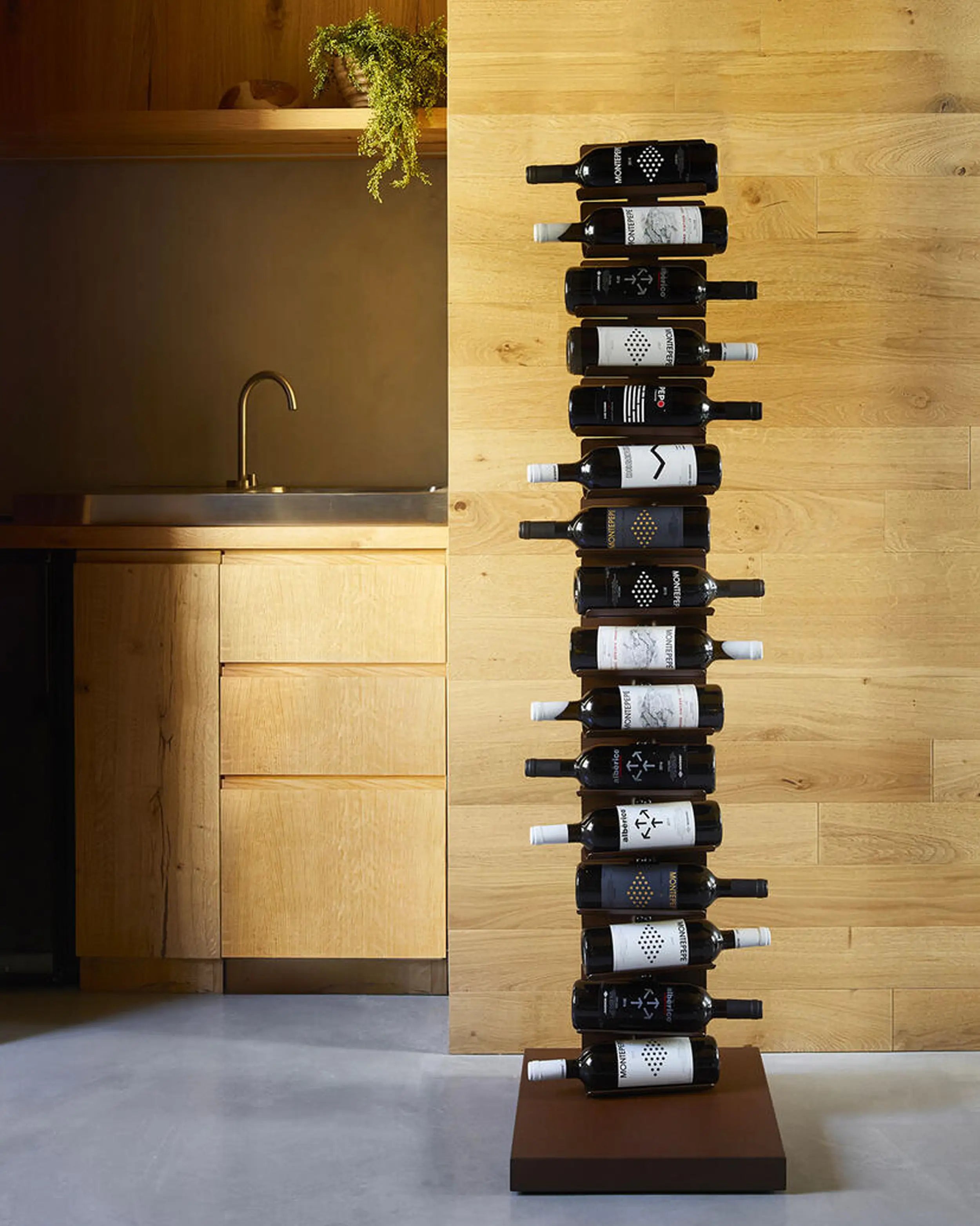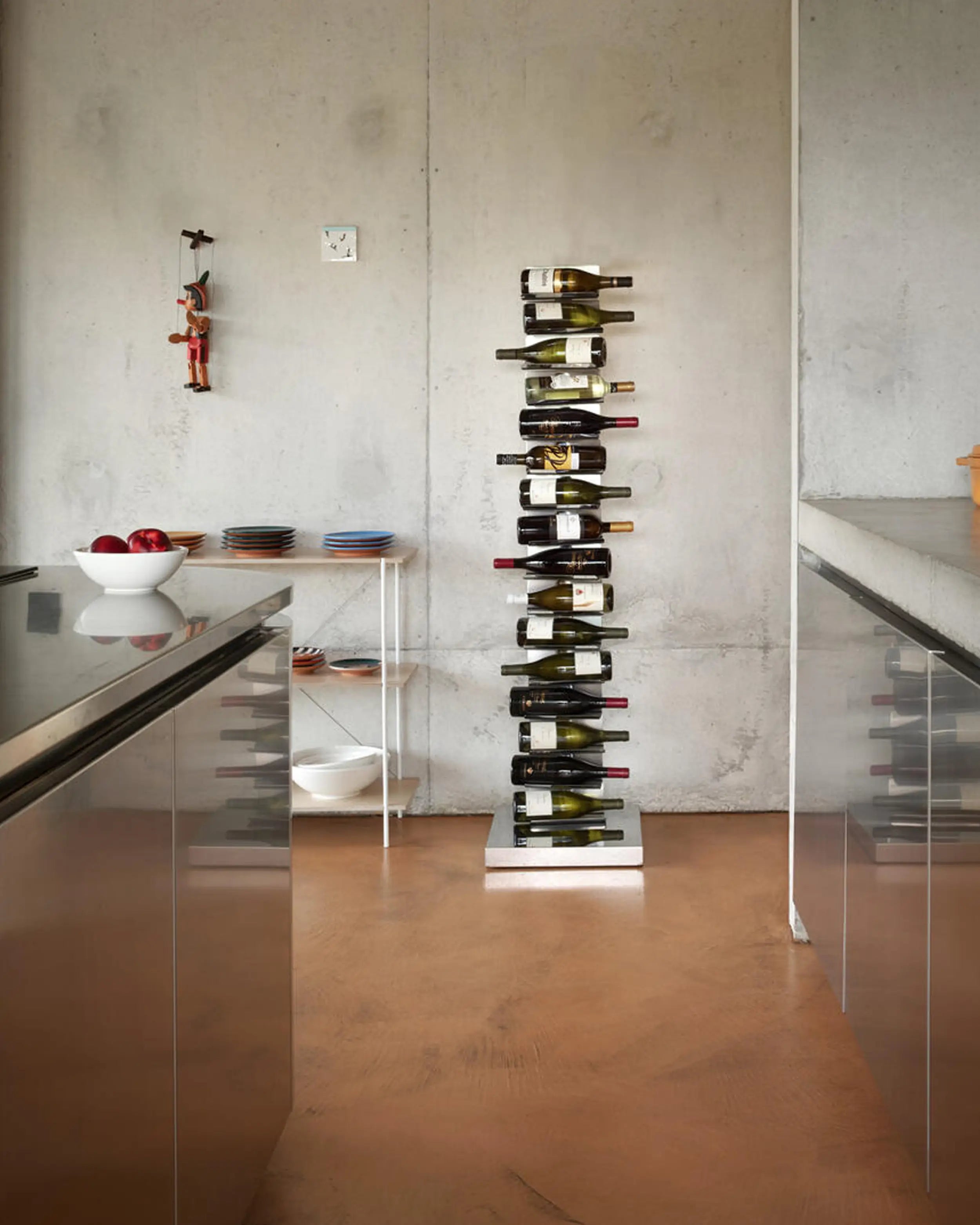 Flaschenregal und verwandelt das Lagern von Flaschen in eine szenografische Geste. Minimalistisch und dennoch kühn fügt es sich nahtlos in anspruchsvolle Innenräume ein und verleiht architektonisches Gleichgewicht und ästhetische Wirkung.