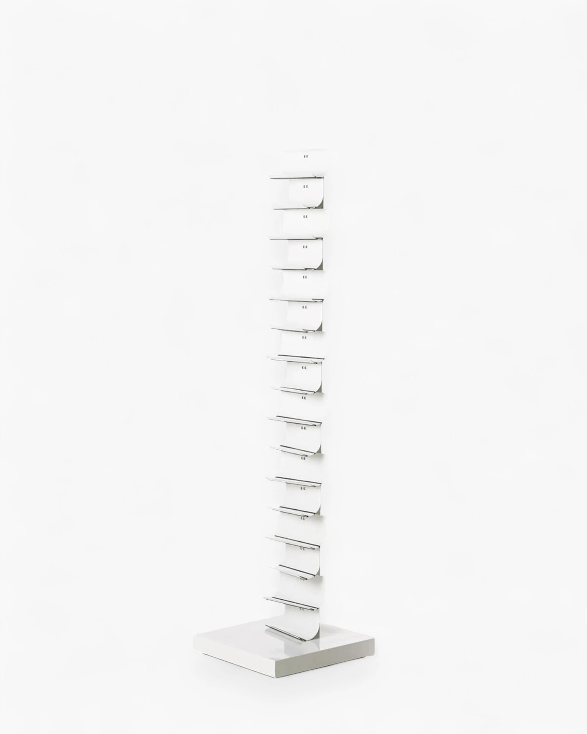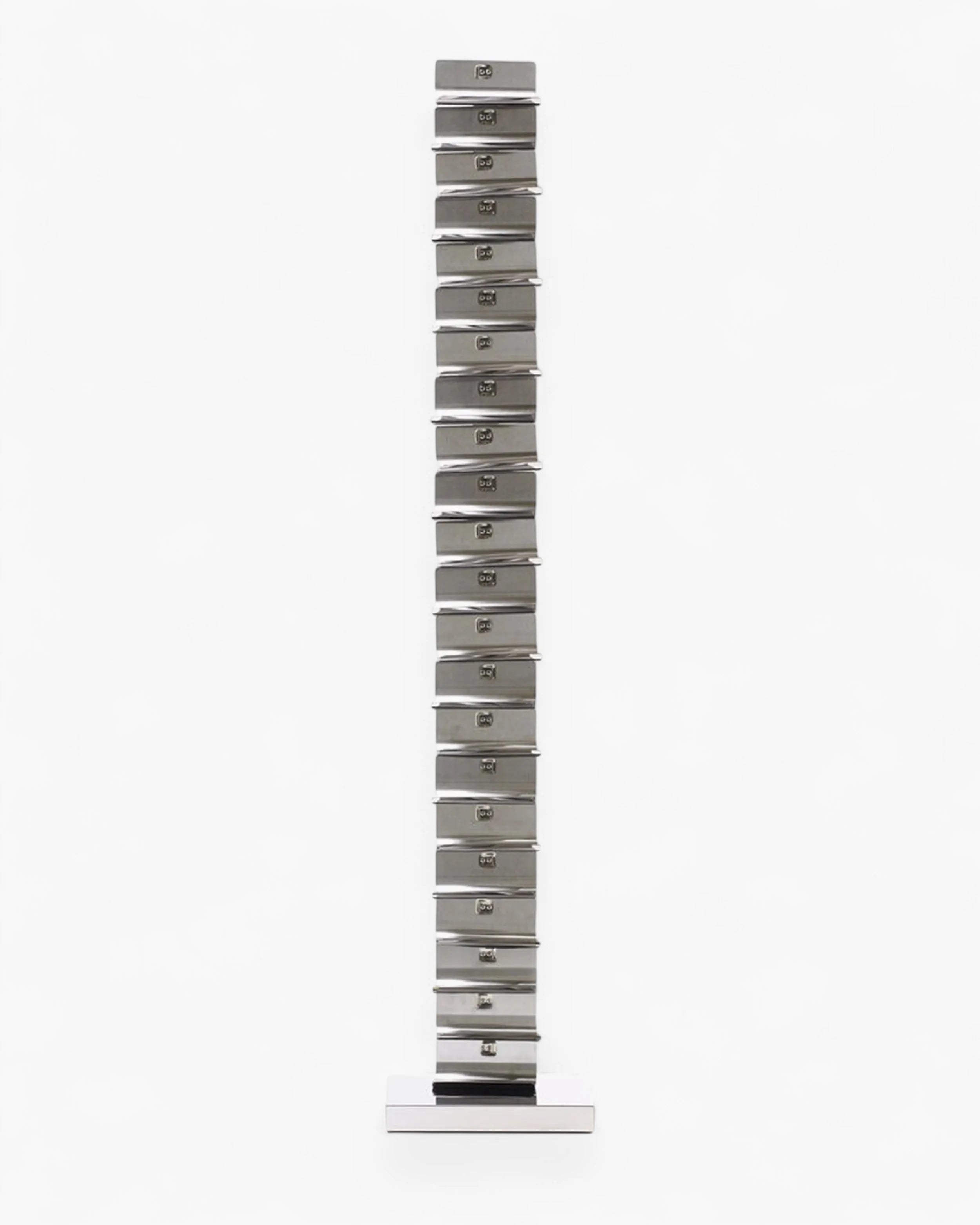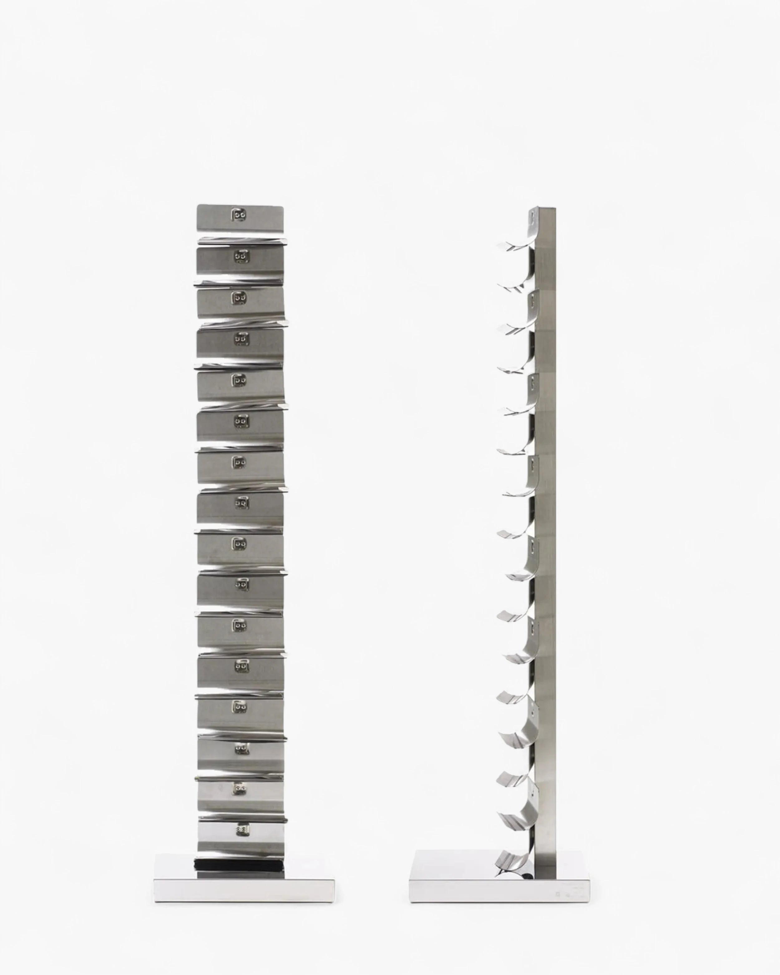 Dieses vollständig aus Stahl gefertigte, vertikale freistehende Gestell ist präzise konstruiert. Es verfügt über verstellbare Füße für perfekte Balance, auch auf unebenen Böden, und Regalböden mit waschbaren, rutschfesten elastischen Bändern für maximale Stabilität. Die eingravierte Signatur des Designers am Sockel erhöht seinen Sammlerwert, während die zwei verfügbaren Formate die Lagerung von bis zu 8, 16 oder 22 Flaschen ermöglichen. Seine skulpturale Präsenz macht es zu einem unverkennbaren Beispiel dafür, wie