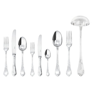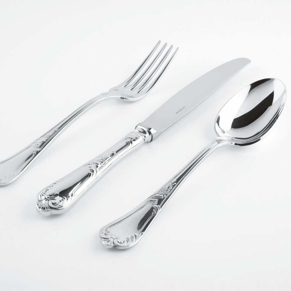 Laurier EPNS 75-teiliges Besteckservice aus galvanisiertem Neusilber, hergestellt von Sambonet . Laurier EPNS ist eine Besteckkollektion, die für das luxuriöse Silbergeschirr des Hofes entworfen wurde und auch von Ludwig XV. für das Besteck von Versailles 1775 gewünscht wurde. Laurier EPNS ist das ideale Besteckservice für Liebhaber von Opulenz und Rokokostil und eignet sich perfekt, um der Mise en Place einen Hauch von Eleganz zu verleihen. Kaufen Sie jetzt Ihr Laurier EPNS-Besteckset.