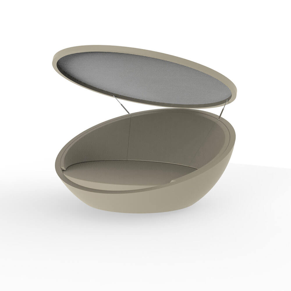 Die ULM-Kollektion von Vondom zeichnet sich durch ein rationalistisches Design und eine Harmonie der Formen aus, die typisch für den Stil von Ramon Esteve sind. Da Vondom gekonnt matt geprägtes Polypropylen verarbeitet, bietet Vondom eine Reihe klassischer Komponenten mit gewundenen Linien an, deren Formen von den Wellen des Meeres geglättet zu sein scheinen. Die ULM-Kollektion besteht aus einem BUTACA-Sessel, einem SOFA, einem MESA-Tisch, einem POUF und einem DAYBED. Das raffinierte DAYBED ULM-Garten-Daybed richtet dank seines mit widerstandsfähigem und abnehmbarem nautischem Leder bezogenen Kissens sowohl Innen- als auch Außenbereiche mit Wesentlichkeit und Stil ein. Das Maxi-Outdoor-Garten-Daybed mit Sonnenschirm ist ein einzigartiges und originelles Einrichtungselement, ein echtes Muss für Ihre Terrassen und Ihren Garten. Die verfügbaren Farben Weiß, Ecru und Bronze sind zarte und schlichte Farbtöne, die perfekt zu allen Arten von Einrichtung und Außenbereichen passen. Kombinieren Sie verschiedene Elemente der ULM-Kollektion miteinander, um neue und trendige Entspannungsbereiche zu schaffen. Gönnen Sie sich einen Moment der Entspannung mit den weichen Formen der ULM-Kollektion.