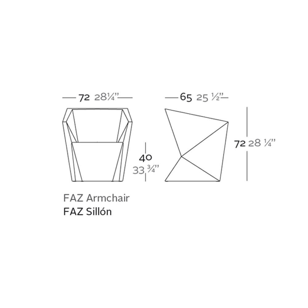 Ο Ramon Esteve δέχεται την πρόσκληση του Vondom για να δημιουργήσει μια από τις πιο σημαντικές κολεξιόν της μάρκας, την FAZ, έναν φόρο τιμής στον καθαρό σχεδιασμό και στο μίνιμαλ στυλ που μπορεί να επιπλώσει με κομψότητα. Η συλλογή FAZ αποτελείται από πολλά διακοσμητικά στοιχεία, όπως καναπέ, καρέκλες, ανάκλιντρα κήπου και βάζα, όλα με το ίδιο στυλ που χαρακτηρίζεται από γεωμετρικά, τετράγωνα, αιχμηρά σχήματα. Vondom δουλεύει με ματ ανάγλυφο πολυπροπυλένιο και αποκτά στοιχεία επίπλωσης που είναι κατάλληλα έργα τέχνης, στοιχεία που μπορούν να μεταμορφώσουν τους χώρους διαβίωσής σας και τους εξωτερικούς σας χώρους σε μια ανεξάρτητη βασιλεία: ο κόσμος της FAZ, όπου τα σχήματα και τα χρώματα δίνουν ζωή σε παιχνίδια με φώτα και αποχρώσεις και τα μεταμορφώνουν σε οι πραγματικοί πρωταγωνιστές. Shop Decor προτείνει την αυθεντική FAZ SILLON, την πολυθρόνα εξωτερικού χώρου που φαίνεται να είναι λαξευμένη απευθείας από ορυκτό, μετατρέποντάς την σε πραγματικό θρόνο με πρωτότυπη επίστρωση, διαθέσιμη σε λευκό, μαύρο, κόκκινο, μπρονζέ και εκρού. Συνδυάστε πολλά στοιχεία επίπλωσης FAZ για να μεταμορφώσετε τις ατμόσφαιρές σας σε έναν εναλλακτικό και ονειρικό κόσμο από έναν άλλο πλανήτη.