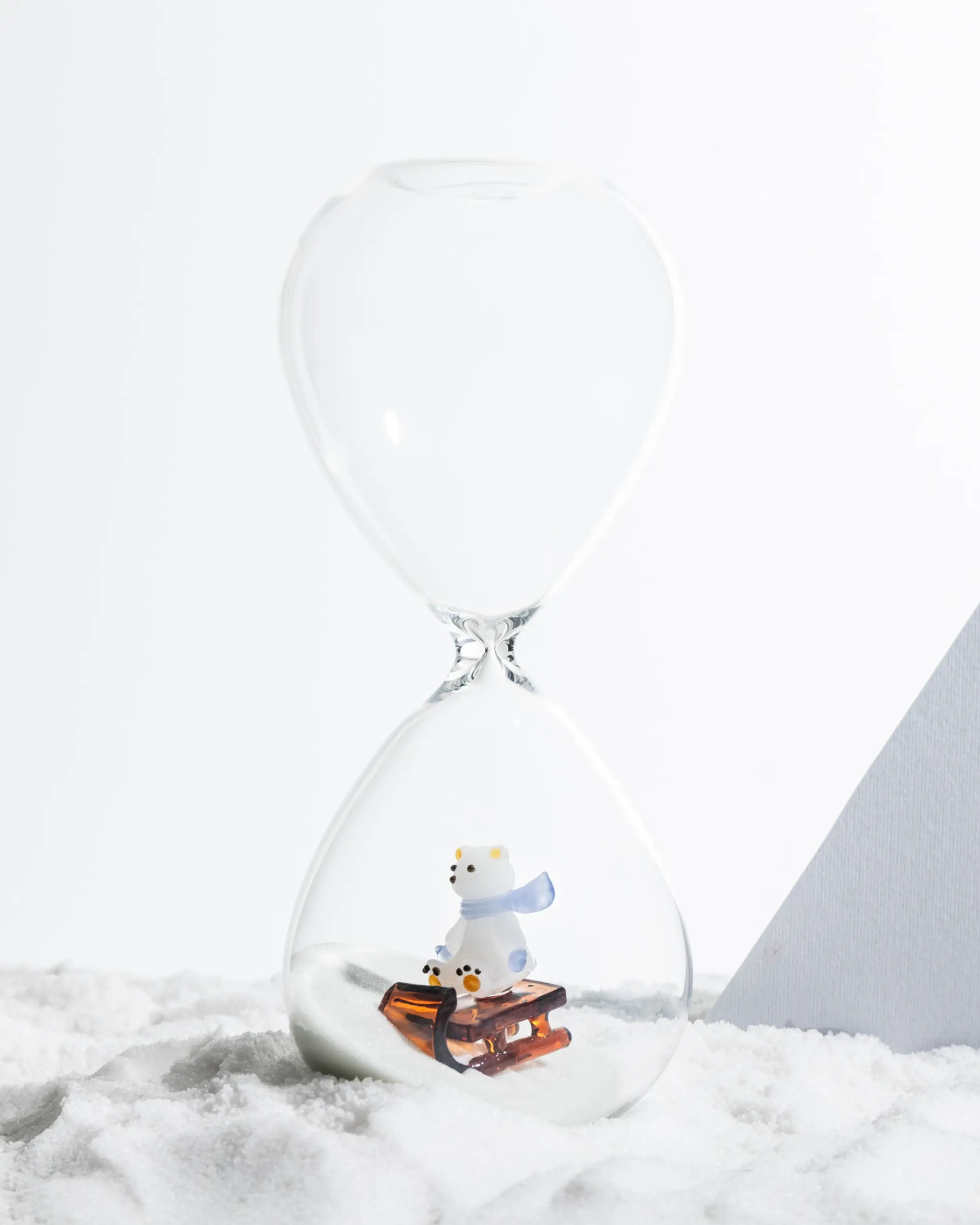 Entirely handmade and lampworked in fine borosilicate glass, this hourglass showcases Ichendorf’s excellence in artisanal glass craftsmanship. Inside, delicate figurative elements evoke winter sports scenes, featuring references to skiing and sledding that appear suspended within the transparent structure. These sculptural details turn the piece into a refined winter sports hourglass decor, where the flow of time becomes part of a visual story. As part of the broader Snow Games family, it dialogues seamlessly with other decorative objects and glassware, reinforcing the poetic identity of the Alessandra Baldereschi x Ichendorf collaboration.