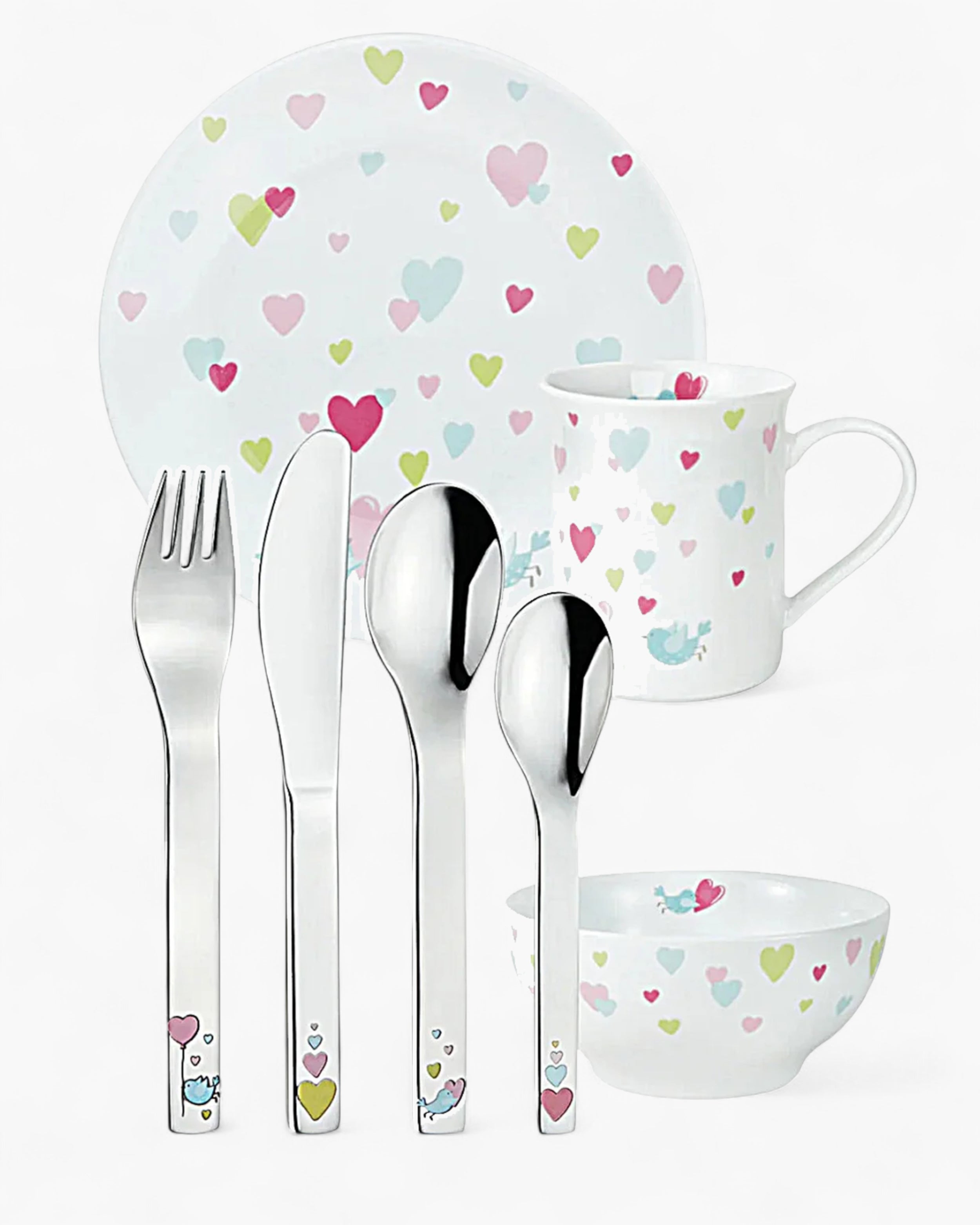 Η σύνθεση των 7 τεμαχίων παρέχει όλα όσα χρειάζονται για να εξερευνήσετε γεύσεις και υφές: κουτάλι μπεμπέ, πιρούνι, μαχαίρι, μίνι κουτάλι, πιάτο, βαθύ πιάτο και κούπα. Εδώ, η χάραξη στα μεταλλικά κομμάτια αντηχεί τα τρυφερά γραφικά στα πορσελάνινα στοιχεία, δημιουργώντας μια συνεκτική εμφάνιση που φαίνεται επιμελημένη αλλά αβίαστη. Σχεδιασμένο από Puresigns Studio, το συνολικό αποτέλεσμα ισορροπεί ανάμεσα στη χαρά και την πειθαρχία—αρκετά όμορφο για ειδικές περιστάσεις, ανθεκτικό για καθημερινή χρήση.Έτοιμο για Δώρο και Σχεδιασμένο να Μεγαλώνει