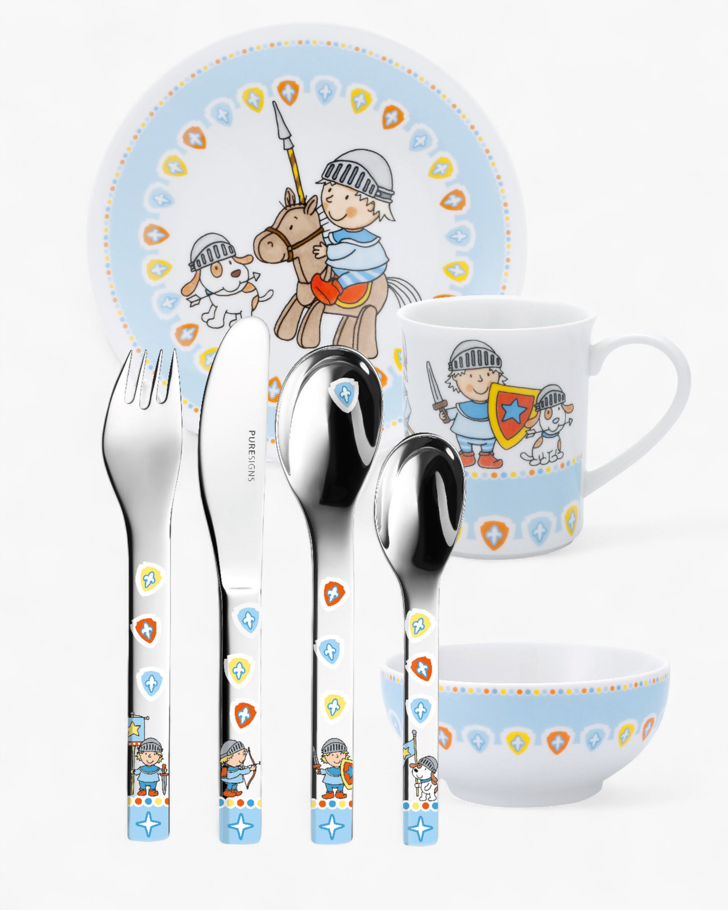 Η υπηρεσία συνδυάζει τρία πορσελάνινα κομμάτια: πιάτο, βαθύ πιάτο και κούπα, με τέσσερα βασικά από ατσάλι: κουτάλι bebè, πιρούνι, μαχαίρι και μίνι κουτάλι. Οι χαράξεις στα μαχαιροπίρουνα αντηχούν ιπποτικά σύμβολα, ενώνοντας το σύνολο ως μια ενιαία ιστορία. Αυτή η πλήρης εισαγωγή στα τραπεζομάντιλα κρατά τους νεαρούς εξερευνητές απασχολημένους ενώ οι ενήλικες εκτιμούν μια μελετημένη αισθητική. Με λίγα λόγια, το knight theme kids dinner set συνδυάζει τη φαντασία με την αξιοπιστία, την ουσία του Puresigns Miko dinner set.Puresigns Σετ Miko 7 τεμαχίων παιδικά σκεύη τραπεζιού