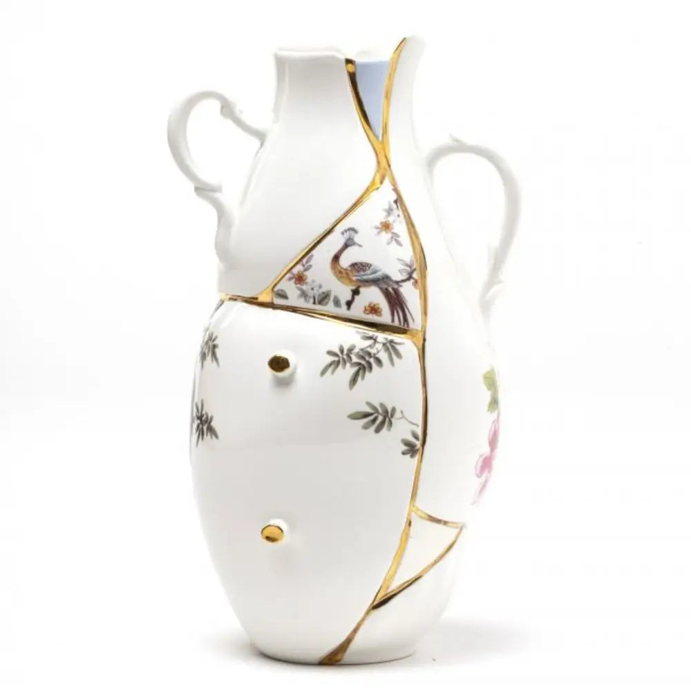 Κατασκευασμένο από εκλεπτυσμένη πορσελάνη Bone China με διακόσμηση 24Κ Χρυσού, αυτό το βάζο σχεδιάστηκε κυρίως για διακοσμητική χρήση, μια σκόπιμη επιλογή που ενισχύει τον γλυπτικό του αντίκτυπο. Αν και η εμφάνισή του φαίνεται ευαίσθητη, είναι φτιαγμένο για να θαυμάζεται, να χειρίζεται και να τοποθετείται με ευκολία, απαιτώντας μόνο απαλό πλύσιμο στο χέρι όπως υποδεικνύεται. Διατίθεται σε διάφορα μεγέθη, συμπεριλαμβανομένων των 19 εκ. και 32 εκ., επιτρέποντας στα εσωτερικά να παίζουν με την κλίμακα, συνδυάζοντας μικρές εκδοχές με ψηλές δηλώσεις ή συνδυάζοντάς τα για δυναμικές, πολυεπίπεδες συνθέσεις. Ως μέρος της διάσημης συλλογής KintsugiSeletti Kintsugi και της σειράς Seletti's Tableware, διατηρεί οπτικό διάλογο με πιάτα, κούπες, δίσκους και μπολ, αντανακλώντας την ξεχωριστή ταυτότητα της συνεργασίας Marcantonio Raimondi Malerba και Seletti. Η δομή του το καθιστά ιδανικό όχι μόνο ως χειροποίητο βάζο Seletti αλλά και ως αυτόνομο διακοσμητικό γλυπτό.Ένα Συλλεκτικό Αξεσουάρ για Επιμελημένους Σύγχρονους Χώρους