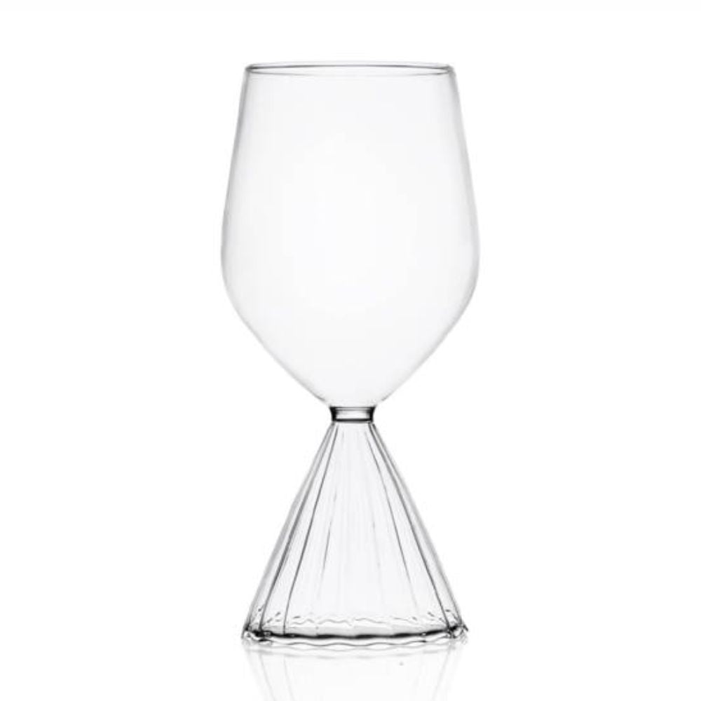 Each Tutu white wine glass is crafted from handmade and lampworked borosilicate glass, a material chosen for its clarity, resilience and lightweight feel. The flame-working process shapes the bowl and stem with careful, continuous movements, resulting in a glass with smooth lines and bright transparency. Although dishwasher safe at low temperatures, the piece should be handled with care, avoiding twisting of the stem during washing or drying to preserve its delicate balance. These small gestures reflect the artisanal nature behind the object and contribute to its refined character.