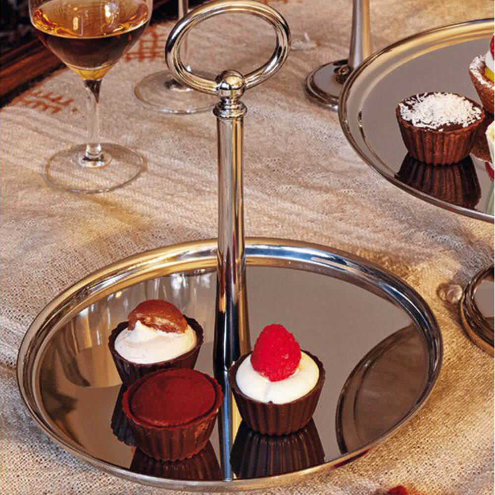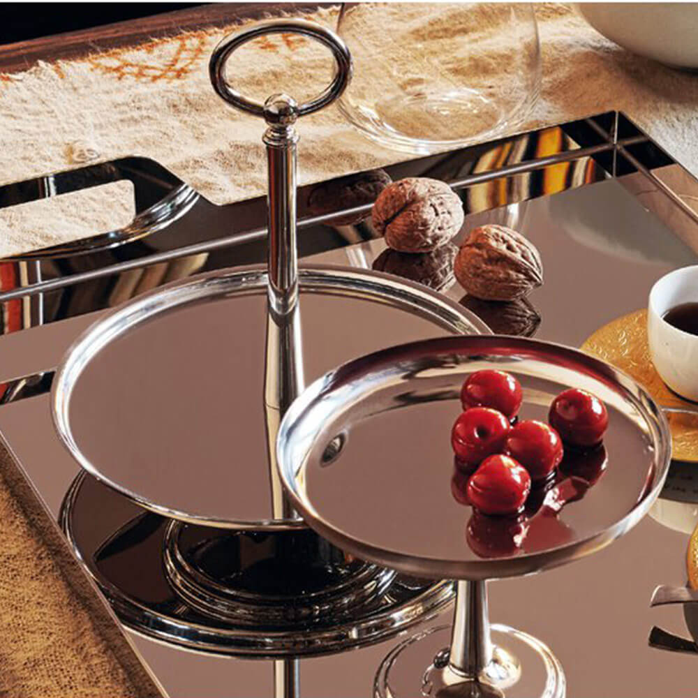 Fabricado por Sambonet, esta pieza encarna la precisión en la manufactura y la calidad duradera del material. La construcción en acero inoxidable garantiza durabilidad y resistencia, manteniendo una superficie pulida y luminosa. Como una solución de lujo para expositor de postres en acero inoxidable, eleva no solo los pasteles sino toda la atmósfera de la mesa. La estructura elevada introduce jerarquía y ritmo, reforzando el ritual de servir mediante una presencia vertical medida.