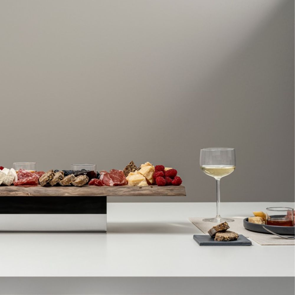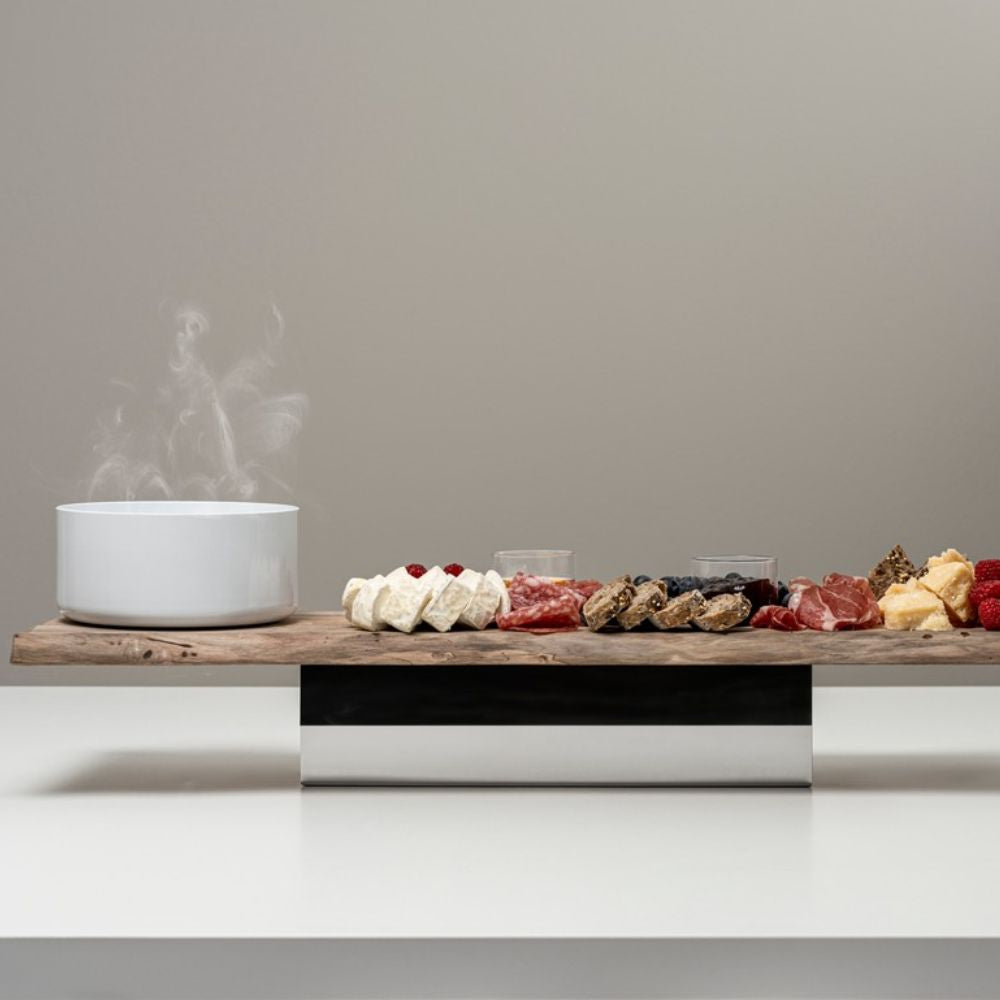 El KnIndustrie Variations On The Table gastronomic centerpiece Essenze es una expresión contemporánea de la utilidad elevada a arte. Diseñado por Sirine Graiaa para KnIndustrie, esta pieza escultórica pertenece a la colección Centerpiece, donde la forma y la función se fusionan en la mesa de comedor. Fabricada con una base sólida de metal y una tabla de cortar de madera bellamente veteada, sirve no solo como un punto focal estético sino también como una plataforma práctica para la presentación de alimentos.