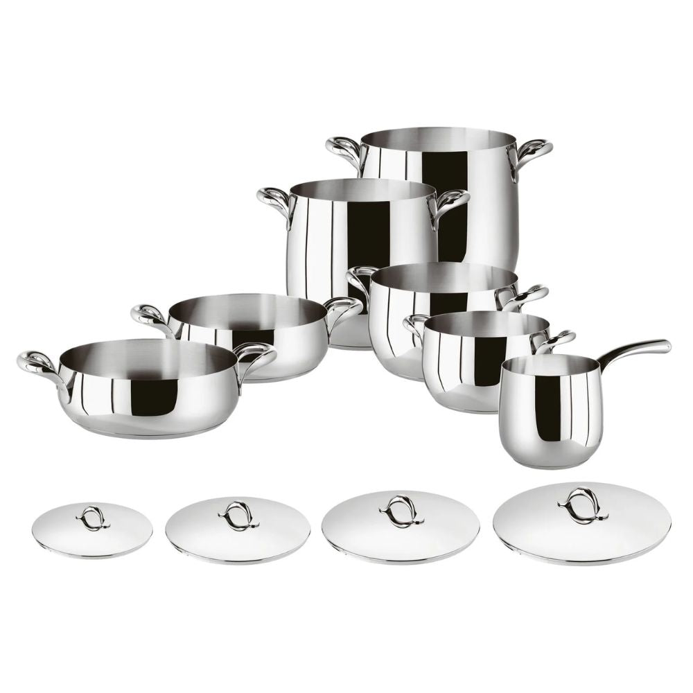 Juego de utensilios de cocina de 11 piezas de la colección Kikka, diseñado y producido por Sambonet. La colección Kikka de ollas y sartenes se distingue por sus formas redondeadas y líneas fluidas que recuperan el encanto de la tradición y la cocina casera, haciendo que las sartenes sean perfectas para cualquier cocina. Descubre toda la colección Kikka y compra tu sartén favorita.