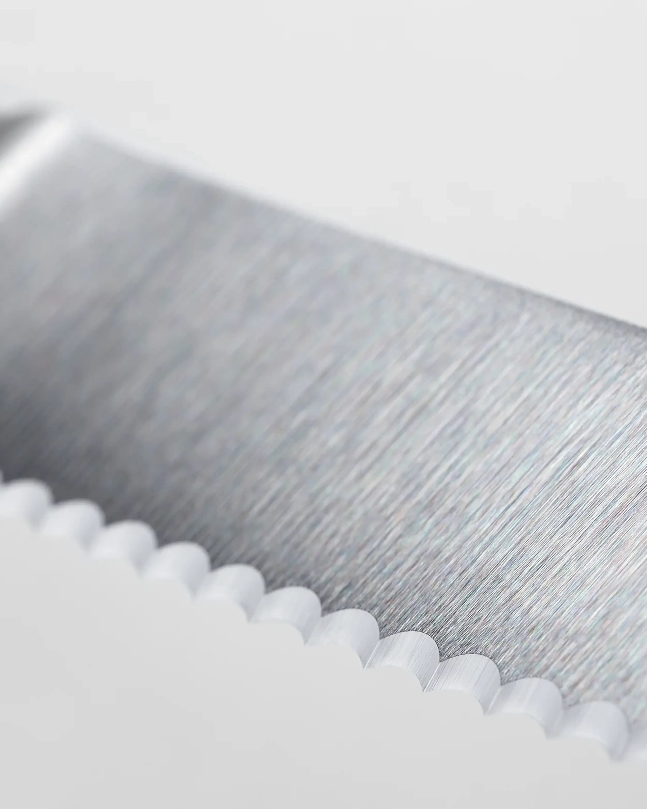 El Wüsthof Classic Ikon serrated utility knife de 14 cm – 5 in es tu cuchilla diaria para un corte impecable. Ya sea que estés cortando panecillos crujientes, tomates, salchichas o embutidos, este pequeño pero poderoso cuchillo Wüsthof ofrece cortes limpios y precisos con un esfuerzo mínimo. Su filo afilado y dentado lo convierte en una herramienta versátil en el mundo de los wusthof all-purpose knives, ideal para cualquier comida, en cualquier momento.