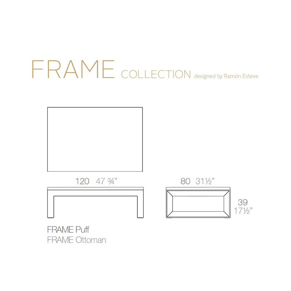 La collection FRAME est née de la créativité et de l'inspiration du designer espagnol Ramón Esteve, exclusivement pour Vondom. La collection a été conçue à partir de la recherche de géométries simples et intemporelles : les résultats sont des compléments aux formes épurées et légères, au design ergonomique et au confort. La collection FRAME est composée du fauteuil BUTACA, du canapé SOFA', de la table MESA 100, de la table MESA 120, de la table MESA 200, du pouf PUFF 120, de la chaise SILLA, du fauteuil SILLON, du tabouret TABURETE BAJO, du banc BANCO, de la chaise longue TUMBONA, de la table TUMBONA, du tabouret TABURETE et de la table MESA 50. Tous ces compléments, fabriqués en polypropylène mat, sont parfaits pour une utilisation en extérieur afin de créer des ambiances chaudes, cosy et élégantes. Shop Decor propose le pouf FRAME PUFF 120. Ses dimensions sont 80 x 120 cm et 39 cm de hauteur.