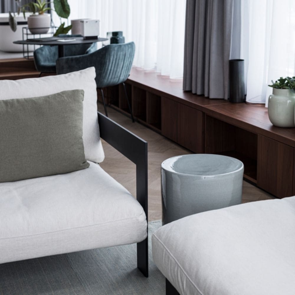 Découvrez la décoration minimaliste de Marie Michielssen, y compris l'emblématique lampadaire Earth et la table d'appoint Pawn pour les espaces de vie modernes.
