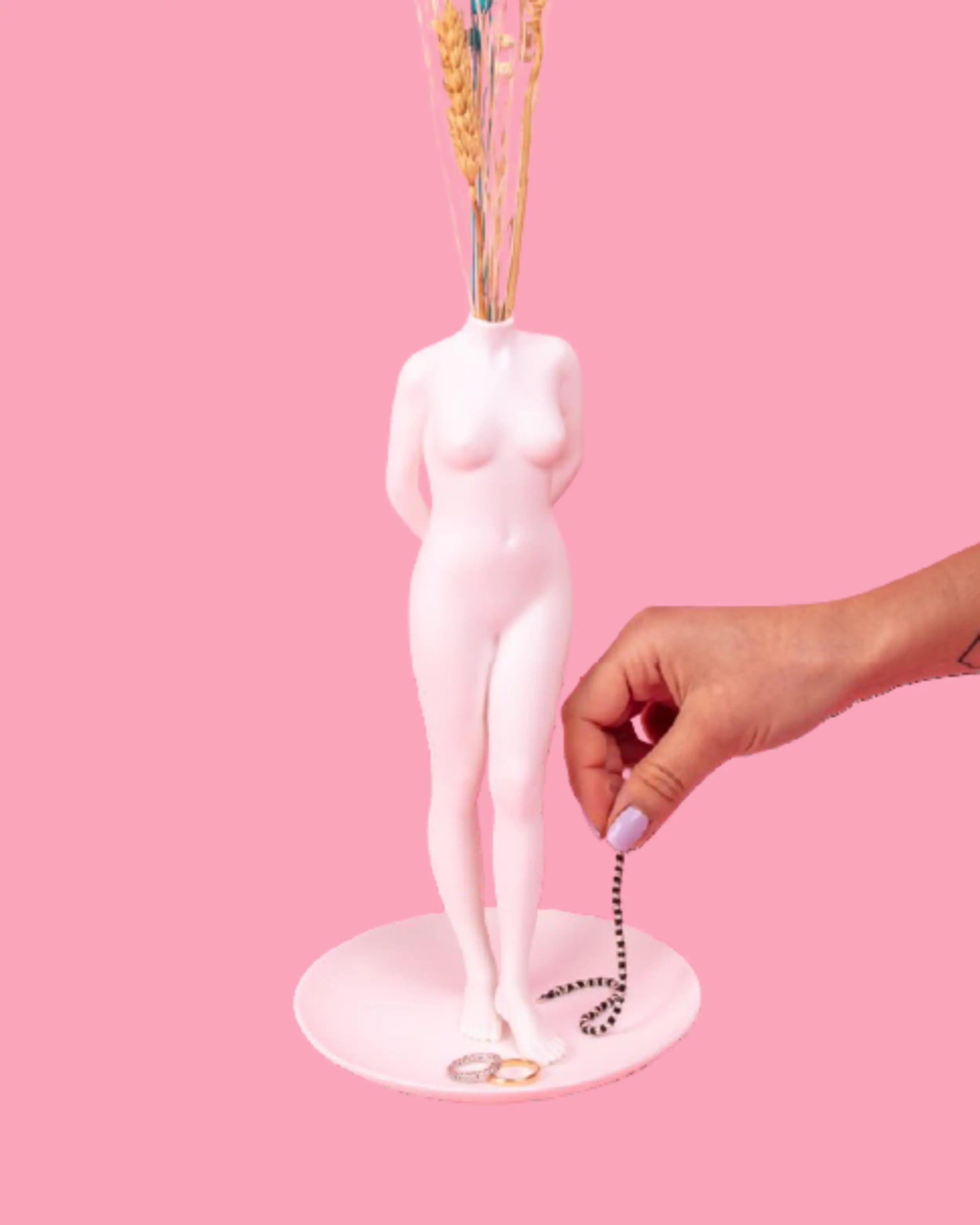 La Timida traduit l’illustration emblématique de l’artiste, la femme fleur, en forme tridimensionnelle : un vase qui ressemble à une silhouette modeste et un plateau peu profond qui recueille clés et petits objets. La pièce se lit à la fois comme un personnage ludique et un récipient discrètement fonctionnel : une seule fleur devient un visage, le plateau devient une petite scène, et les rituels quotidiens gagnent un compagnon humain et illustré.