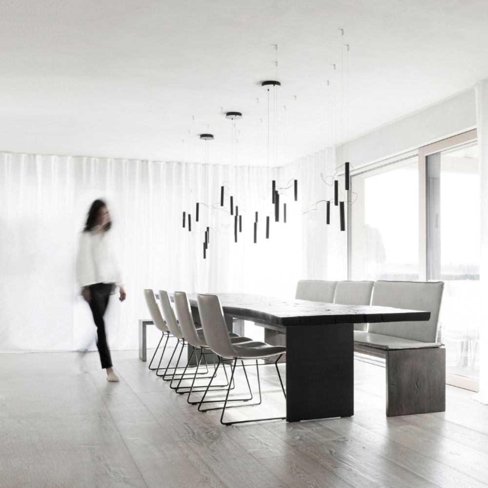 Le célèbre designer Davide Groppi crée pour la marque de luminaires homonyme la lampe à suspension Simbiosi. Essentielle et moderne, ce nouveau concept de lampe enrichira tous vos espaces de vie en les rendant plus accueillants et contemporains. La lampe Simbiosi se compose de 8 lampes reliées entre elles par un câble très fin. Vous pouvez choisir la configuration des lampes en allongeant et en raccourcissant les câbles reliés directement au plafond, seules deux lampes sont reliées directement à la rosace centrale. Laissez l'art entrer dans votre maison et épatez vos invités avec la lampe Simbiosi.