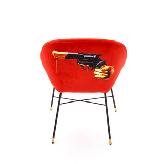 Part of the iconic Toiletpaper Home Furniture collection, this piece belongs to a family of designs that includes Snakes Black, Lipsticks, Roses, Revolver, and Shit: each an emblem of Cattelan & Ferrari’s creative language. The polyurethane padded chair finds its place not only at a dining table but also in eclectic lounges, creative studios, and artistic interiors. Its bold print and refined silhouette bridge the gap between pop surrealism and contemporary elegance, inviting admiration and conversation wherever it stands.