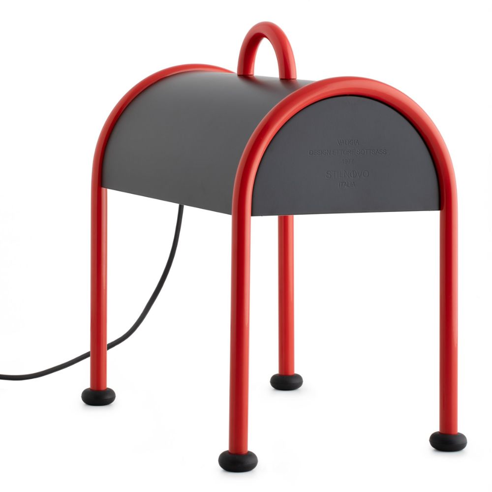 Lampe de table/sol Valigia, créée par le célèbre designer Ettore Sottsass pour la marque Stilnovo. Valigia est une lampe "nomade", conçue dans le but de pouvoir être déplacée facilement. La lampe a été présentée pour la première fois en 1977 et est aujourd'hui considérée comme une icône de Ettore Sottsass. Une lampe au design ironique capable d'apporter une touche d'élégance à n'importe quelle pièce.