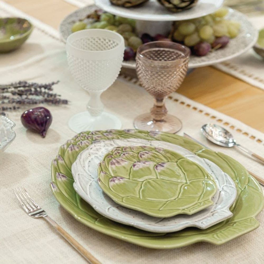 Il motivo iconico del carciofo fa parte del linguaggio visivo di Bordallo Pinheiro da oltre un secolo. In questo piatto in ceramica dipinto a mano, le sue foglie sovrapposte creano una superficie tattile che cattura la luce come un rilievo scolpito. Il pezzo si presenta sia come funzione che come opera d'arte, un accento decorativo che unisce l'uso quotidiano con l'appeal senza tempo della porcellana da tavola portoghese. Le smaltature spazzolate a mano evidenziano ogni contorno, celebrando la fusione di umorismo, artigianato e ispirazione naturale tipica dell'eredità di Bordallo.