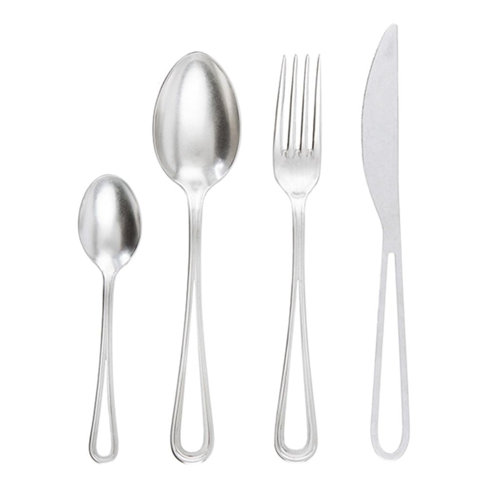 Questo set da 24 pezzi include 6 cucchiai da tavola, 6 forchette da tavola, 6 coltelli da tavola e 6 cucchiaini da tè—ognuno progettato per una presa perfetta e una durata prolungata. Adatto all'uso alimentare e completamente lavabile in lavastoviglie, questo set stainless steel cutlery set knindustrie presenta una finitura opaca, leggermente ruvida che richiama l'artigianalità.