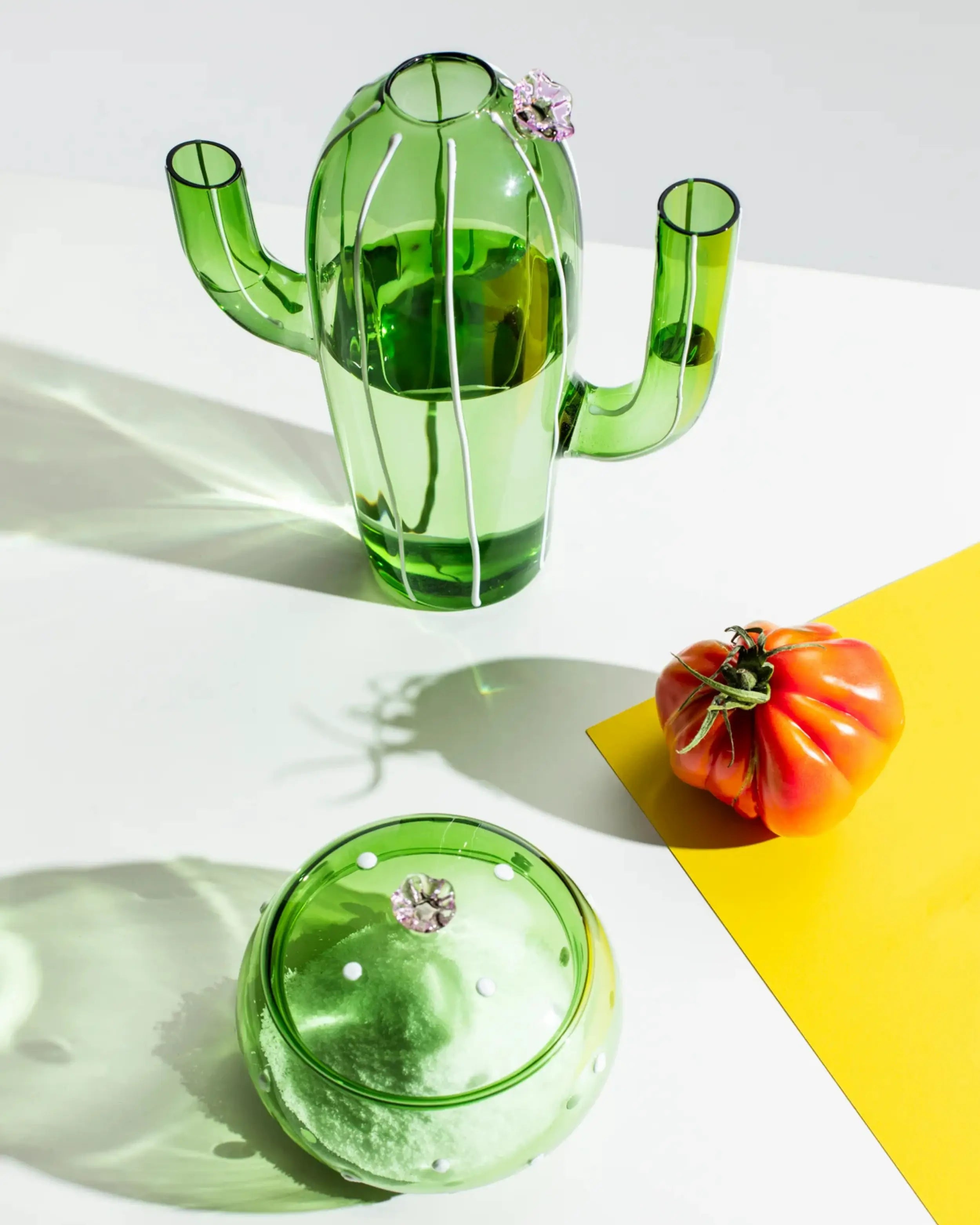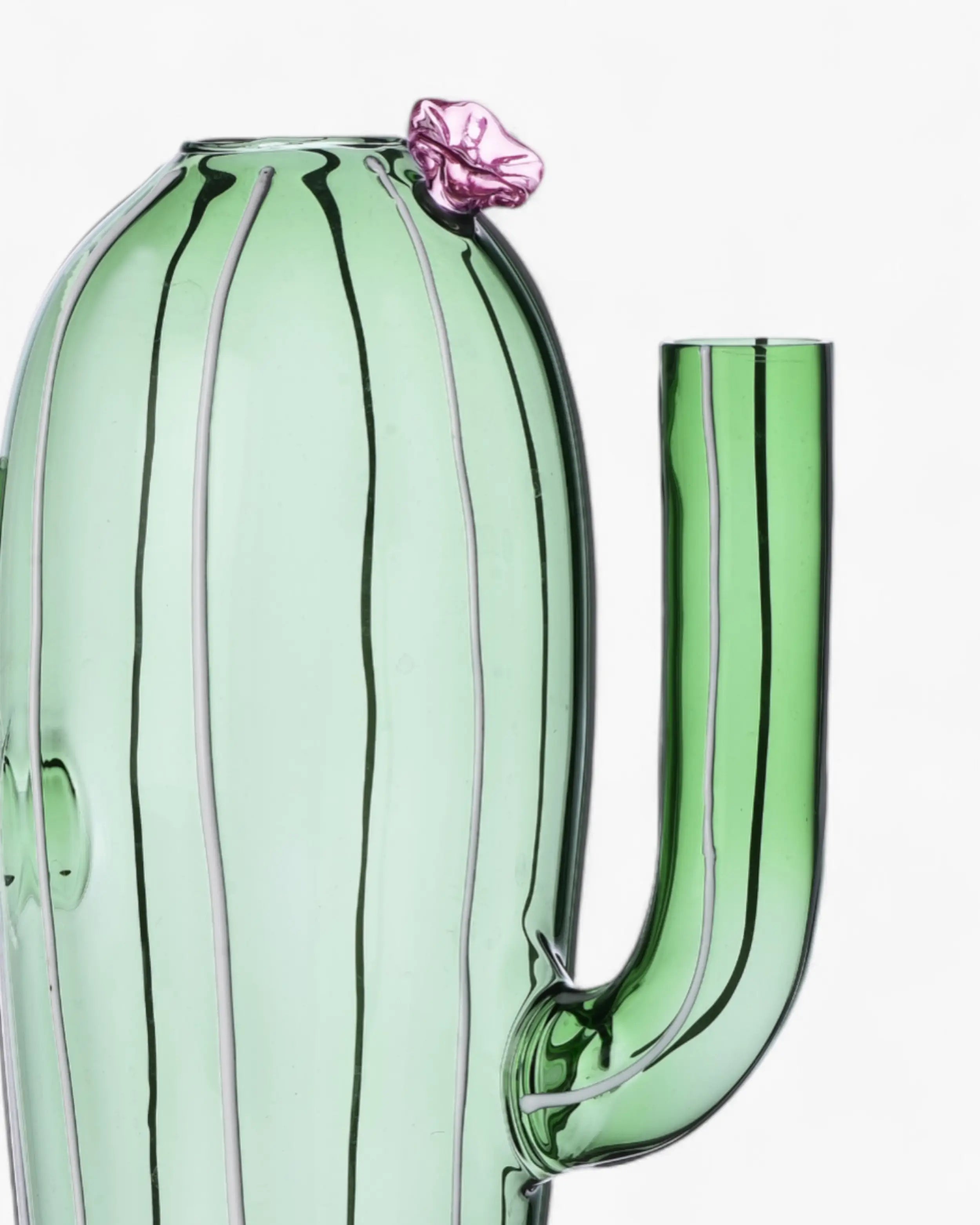 A prima vista, il Ichendorf Brocca Desert Plants con Cactus sorprende con la sua anima giocosa e la tecnica raffinata. Progettata da Alessandra Baldereschi, questa brocca trasforma l'immagine di un cactus in una presenza delicata scolpita in vetro borosilicato. Il processo artigianale mette in risalto la fragilità e la resilienza del materiale, creando un contrasto con la forza e il simbolismo della flora del deserto.