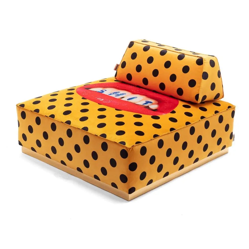 Questo large pouf 103x103 appartiene all’eclettica Toiletpaper Home Furniture family, dove l’arredamento viene reinventato come narrazione visiva. I motivi surreali sono Serpenti, Spaghetti, Rose, Ragazza Nel Mare e Rossetti, ognuno simbolo della capacità di Cattelan & Ferrari di trasformare l’immaginazione in forma. Che sia abbinato ai moduli corrispondenti del Seletti Toiletpaper pouf o contrapposto ad altre stampe, il pezzo introduce ritmo e narrazione negli interni. Ogni dettaglio, dalla cucitura alla curvatura, traduce il pop surrealismo in design tangibile.